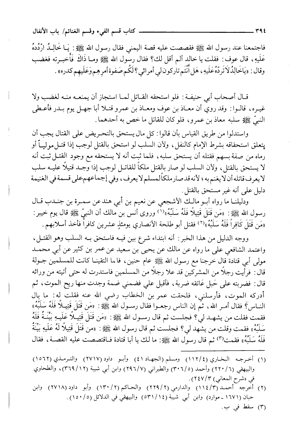وَوَجْهُ الدَّلِيلِ مِنْ هَذَا الْخَبَرِ: أَنَّهُ ابْتِدَاءُ شَرْعٍ بَيِّنٍ فِيهِ فَاسْتُحِقَّ بِهِ السَّلَبُ وَهُوَ الْقَتْلُ، وَاعْتَمَدَ الشَّافِعِيُّ عَلَى مَا رَوَاهُ عَنْ مَالِكٍ عَنْ يَحْيَى بْنِ سَعِيدٍ عَنْ عُمَرَ بْنِ كَثِيرٍ عَنْ أَبِي محمد مَوْلَى أَبِي قَتَادَةَ قَالَ خَرَجْنَا مَعَ رَسُولِ اللَّهِ - صَلَّى اللَّهُ عَلَيْهِ وَسَلَّم َ - عَامَ حُنَيْنٍ، فَلَمَّا الْتَقَيْنَا كَانَتْ لِلْمُسْلِمِينَ جَوْلَةٌ قَالَ: فَرَأَيْتُ رَجُلًا مِنَ الْمُشْرِكِينَ قَدْ عَلَا رَجُلًا مِنَ الْمُسْلِمِينَ فَاسْتَدَرْتُ لَهُ حَتَّى أَتَيْتُهُ مِنْ وَرَائِهِ قَالَ: فَضَرَبْتُهُ عَلَى حَبْلِ عَاتِقِهِ ضَرْبَةً، فَأَقْبَلَ عَلَيَّ فَضَمَّنِي ضَمَّةً وَجَدْتُ مِنْهَا رِيحَ الْمَوْتِ، ثُمَّ أَدْرَكَهُ الْمَوْتُ، فَأَرْسَلَنِي، فَلَحِقْتُ عُمَرَ بْنَ الْخَطَّابِ رَضِيَ اللَّهُ عَنْهُ فَقُلْتُ لَهُ: مَا بَالُ النَّاسِ؟ فَقَالَ أَمْرُ اللَّهِ، ثُمَّ إِنَّ النَّاسَ رَجَعُوا فَقَالَ رَسُولُ اللَّهِ - صَلَّى اللَّهُ عَلَيْهِ وَسَلَّم َ -: " مَنْ قَتَلَ قَتِيلًا فَلَهُ سَلَبُهُ " فَقُمْتُ فَقُلْتُ مَنْ يَشْهَدُ لِي؟ فَجَلَسْتُ ثُمَّ قَالَ رَسُولُ اللَّهِ - صَلَّى اللَّهُ عَلَيْهِ وَسَلَّم َ -: " مَنْ قَتَلَ قَتِيلًا عَلَيْهِ بَيِّنَةٌ فَلَهُ سَلَبُهُ " فَقُمْتُ وَقُلْتُ مَنْ يَشْهَدُ لِي؟ فَجَلَسْتُ ثُمَّ قَالَ رَسُولُ اللَّهِ - صَلَّى اللَّهُ عَلَيْهِ وَسَلَّم َ -: " مَنْ قَتَلَ قَتِيلًا لَهُ عَلَيْهِ بَيِّنَةٌ فَلَهُ سَلَبُهُ " فَقُمْتُ ثُمَّ قَالَ رَسُولُ اللَّهِ - صَلَّى اللَّهُ عَلَيْهِ وَسَلَّم َ - " مَا لَكَ يَا أَبَا قَتَادَةَ فَاقْتَصَصْتُ عَلَيْهِ القصة، فقال