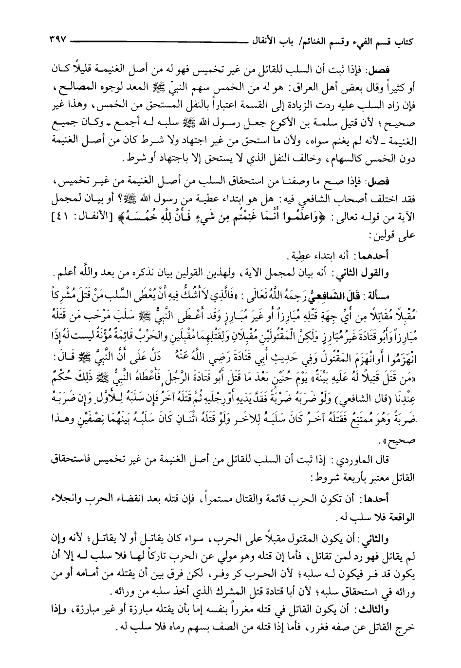 قَالَ الْمَاوَرْدِيُّ: إِذَا ثَبَتَ أَنَّ السَّلَبَ لِلْقَاتِلِ مِنْ أَصْلِ الْغَنِيمَةِ مِنْ غَيْرِ تَخْمِيسٍ فَاسْتِحْقَاقُ الْقَاتِلِ مُعْتَبَرٌ بِأَرْبَعَةِ شُرُوطٍ: