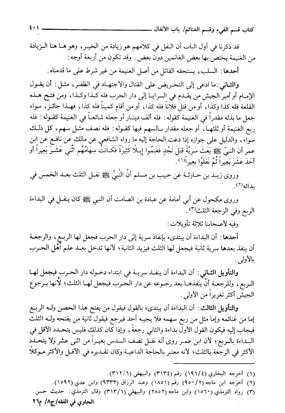 قَدْ ذَكَرْنَا فِي أَوَّلِ الْبَابِ أَنَّ النَّفْلَ فِي كَلَامِهِمْ هُوَ زِيَادَةٌ مِنَ الْخَيْرِ، وَهُوَ ها هنا الزِّيَادَةُ مِنَ الْغَنِيمَةِ يُخْتَصُّ بِهَا بَعْضُ الْغَانِمِينَ دُونَ بَعْضٍ. وَقَدْ تَكُونُ مِنْ أَرْبَعَةِ أَوْجُهٍ: