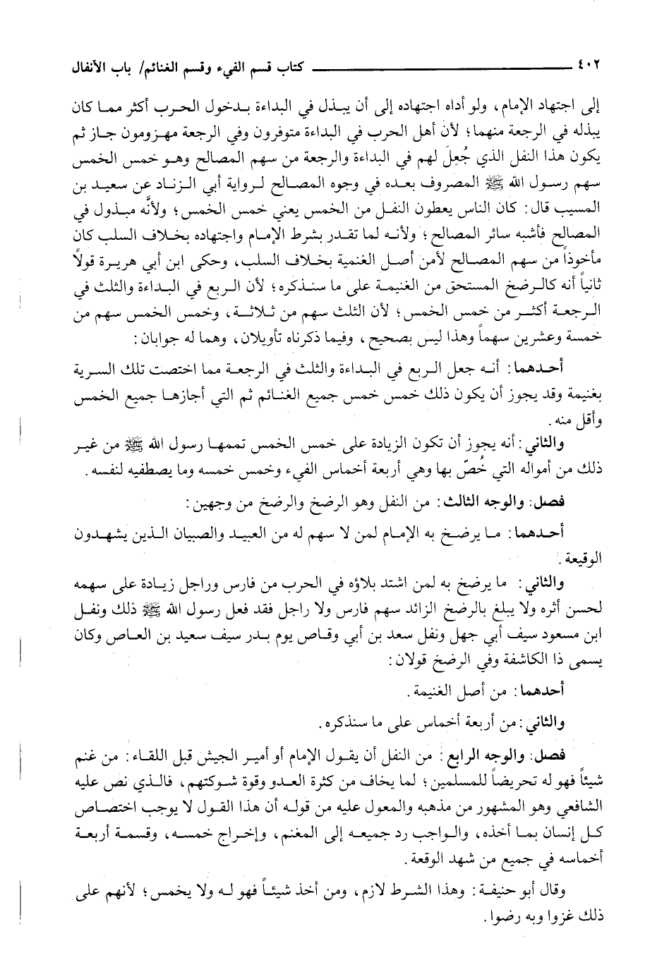 وَالثَّانِي: مَا يَرْضَخُ بِهِ لِمَنِ اشْتَدَّ بَلَاؤُهُ فِي الْحَرْبِ مِنْ فَارِسٍ وَرَاجِلٍ زِيَادَةً عَلَى سَهْمِهِ لِحُسْنِ أَثَرِهِ وَلَا يَبْلُغُ بِالرَّضْخِ الزَّائِدِ سَهْمَ فَارِسٍ وَلَا رَاجِلٍ فَقَدْ فَعَلَ رَسُولُ اللَّهِ - صَلَّى اللَّهُ عَلَيْهِ وَسَلَّم َ - ذَلِكَ وَنَفَلَ ابْنَ مَسْعُودٍ سَيْفَ أَبِي جَهْلٍ وَنَفَلَ سَعْدَ بْنَ أَبِي وَقَّاصٍ يَوْمَ بَدْرٍ سَيْفَ سَعِيدِ بْنِ الْعَاصِ وَكَانَ يُسَمَّى ذَا الْكَاشِفَةِ وَفِي الرَّضْخِ قَوْلَانِ: