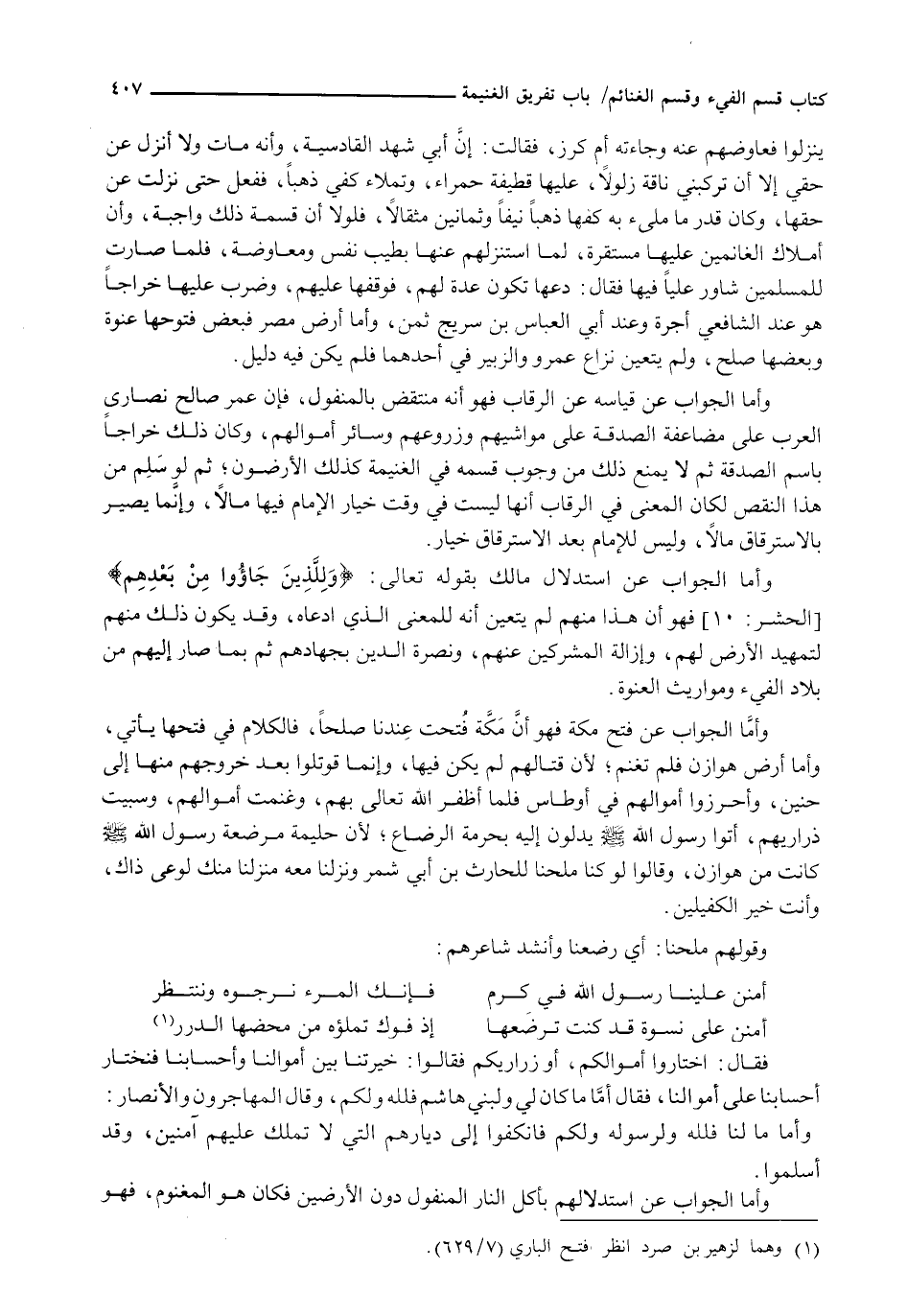 يَنْزِلُوا فَعَاوَضَهُمْ عَنْهُ وَجَاءَتْهُ أُمُّ كُرْزٍ، فَقَالَتْ: إني أَبِي شَهِدَ الْقَادِسِيَّةِ، وَإِنَّهُ مَاتَ وَلَا أَنْزِلُ عن حقي إلا أن تركبني ناقة زلولا، عليها قطيفة حمراء، وتملاء كَفِّي ذَهَبًا، فَفَعَلَ حَتَّى نَزَلَتْ عَنْ حَقِّهَا، وَكَانَ قَدْرُ مَا مُلِئَ بِهِ كَفُّهَا ذَهَبًا نيفا وثمانين مثقالا، فولا أَنَّ قِسْمَةَ ذَلِكَ وَاجِبَةٌ، وَأَنَّ أَمْلَاكَ الْغَانِمِينَ عَلَيْهَا مُسْتَقِرَّةٌ، لَمَا اسْتَنْزَلَهُمْ عَنْهَا بِطِيبِ نَفْسٍ وَمُعَاوَضَةٍ، فَلَمَّا صَارَتْ لِلْمُسْلِمِينَ شَاوَرَ عَلِيًّا فِيهَا فَقَالَ: دَعْهَا تَكُونُ عُدَّةً لَهُمْ، فَوَقَفَهَا عَلَيْهِمْ، وَضَرَبَ عَلَيْهَا خَرَاجًا هُوَ عِنْدَ الشَّافِعِيِّ أُجْرَةٌ وَعِنْدَ أَبِي الْعَبَّاسِ بْنِ سُرَيْجٍ ثَمَنٌ، وَأَمَّا أرض مصر فبعض فتوحها عنوة وبعضها صلح، وَلَمْ يَتَعَيَّنْ نِزَاعُ عَمْرٍو وَالزُّبَيْرِ فِي أَحَدِهِمَا فَلَمْ يَكُنْ فِيهِ دَلِيلٌ.