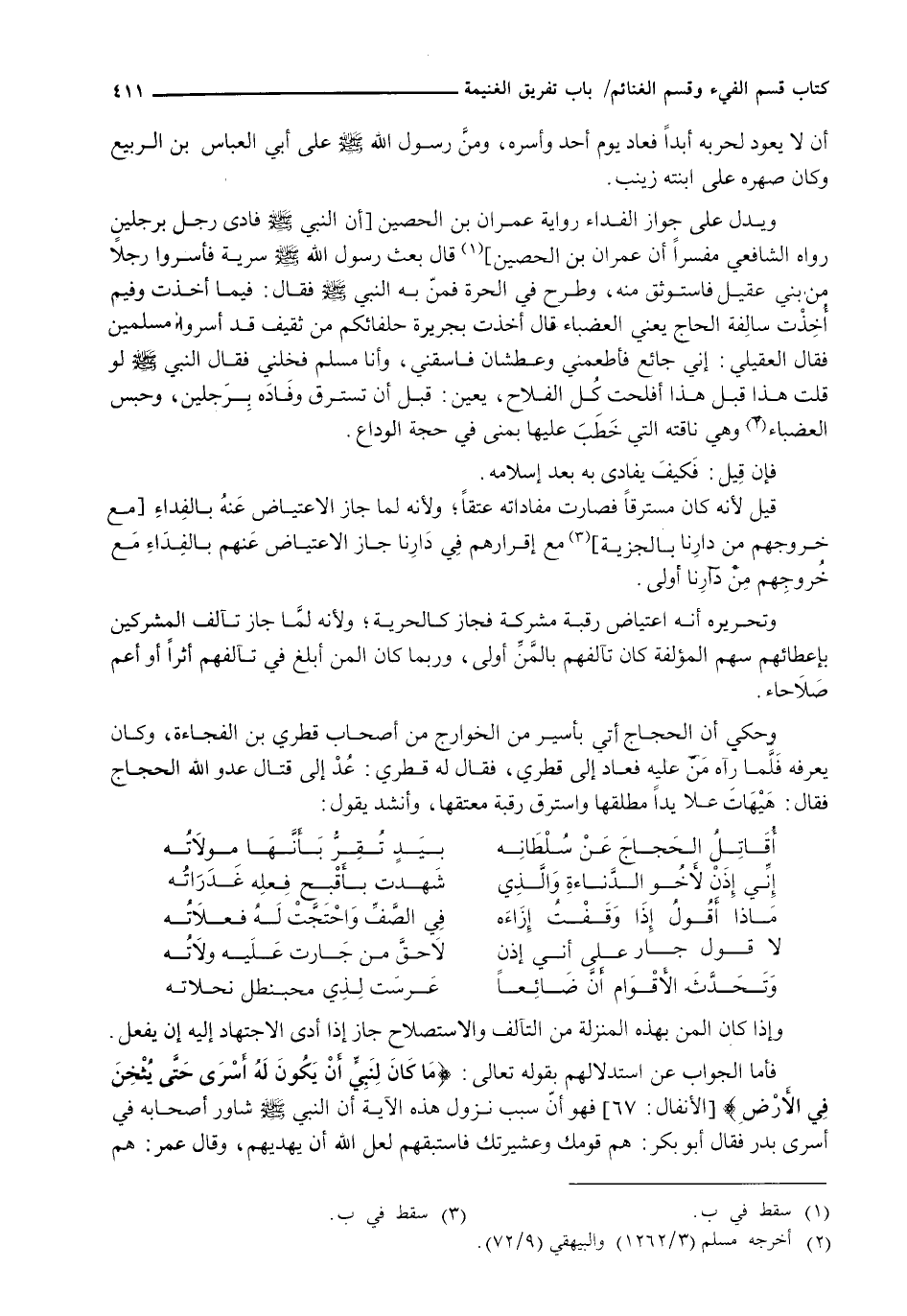 وَيَدُلُّ عَلَى جَوَازِ الْفِدَاءِ رواية عِمْرَانُ بْنُ الْحُصَيْنِ [أَنَّ النَّبِيَّ - صَلَّى اللَّهُ عَلَيْهِ وَسَلَّم َ - فادى رجل برجلين رواه الشافعي مفسرا أن عِمْرَانَ بْنِ الْحُصَيْنِ] قَالَ بَعَثَ رَسُولُ اللَّهِ - صَلَّى اللَّهُ عَلَيْهِ وَسَلَّم َ - سرية فأسروا رجلا من بني عقيل فاستوثق منه، وطرح في الحرة فمن به النبي - صَلَّى اللَّهُ عَلَيْهِ وَسَلَّم َ - فقال: فيما أخذت وفيم أُخذت سالفة الحاج يعني العضباء قال أخذت بجريرة حلفائكم مِنْ ثَقِيفٍ قَدْ أَسَرُوا مُسْلِمِينَ فَقَالَ الْعُقَيْلِيُّ: إِنِّي جَائِعٌ فَأَطْعِمْنِي وَعَطْشَانٌ فَاسْقِنِي، وَأَنَا مُسْلِمٌ فَخَلِّنِي فَقَالَ النَّبِيُّ - صَلَّى اللَّهُ عَلَيْهِ وَسَلَّم َ - لَوْ قُلْتَ هَذَا قَبْلَ هَذَا أَفْلَحْتَ كُلَّ الفلاح، يعني: قبل أن تسترق وفاده بِرَجُلَيْنِ، وَحَبَسَ الْعَضْبَاءَ وَهِيَ نَاقَتُهُ الَّتِي خَطَبَ عَلَيْهَا بِمِنًى فِي حَجَّةِ الْوَدَاعِ.