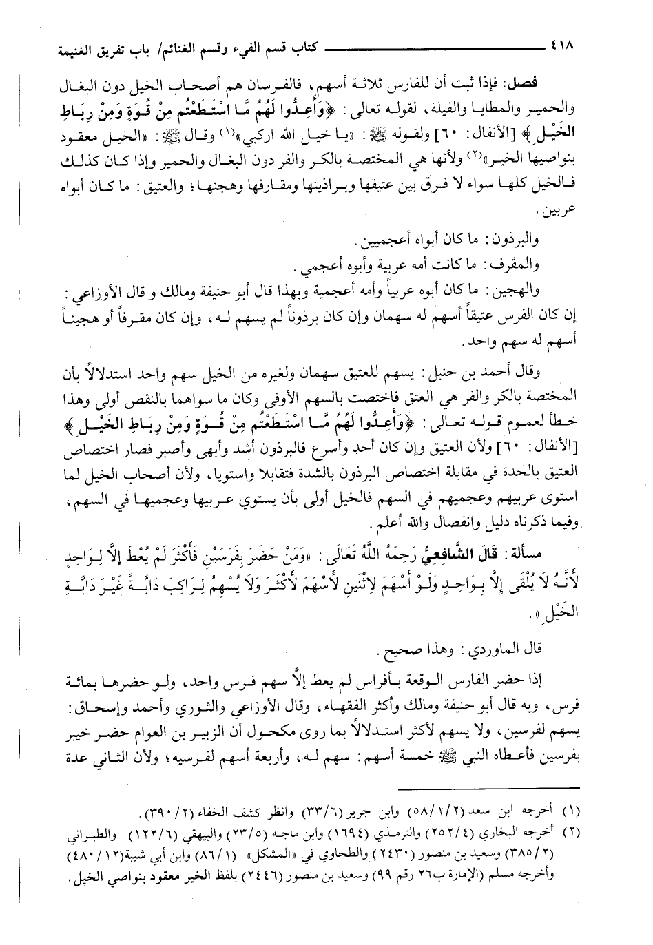 فَإِذَا ثَبَتَ أَنَّ لِلْفَارِسِ ثَلَاثَةَ أَسْهُمٍ، فَالْفُرْسَانُ هُمْ أَصْحَابُ الْخَيْلِ دُونَ الْبِغَالِ وَالْحَمِيرِ وَالْمَطَايَا وَالْفِيَلَةِ، لِقَوْلِهِ تَعَالَى: {وَأَعِدُّوا لَهُمْ مَا اسْتَطَعْتُمْ مِنْ قُوَّةٍ وَمِنْ رِبَاطِ الْخَيْلِ} [الأنفال: 60] ولقوله - صَلَّى اللَّهُ عَلَيْهِ وَسَلَّم َ -: " يَا خَيْلَ اللَّهِ ارْكَبِي " وَقَالَ - صَلَّى اللَّهُ عَلَيْهِ وَسَلَّم َ -: " الخيل مقعود بِنَوَاصِيهَا الْخَيْرُ " وَلِأَنَّهَا هِيَ الْمُخْتَصَّةُ بِالْكَرِّ وَالْفَرِّ دُونَ الْبِغَالِ وَالْحَمِيرِ وَإِذَا كَانَ كَذَلِكَ فَالْخَيْلُ كُلُّهَا سَوَاءٌ لَا فَرْقَ بَيْنَ عَتِيقِهَا وبَرَاذِينِهَا ومقارفها وهجنها؛ والعتيق: ما كان أبواه عربين.