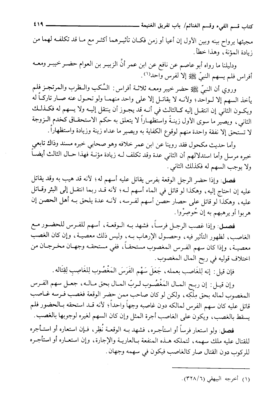 وَإِذَا غَصَبَ الرَّجُلُ فَرَسًا، فَشَهِدَ بِهِ الْوَقْعَةَ، أُسْهِمَ لِلْفَرَسِ لِلْحُضُورِ مَعَ الْغَاصِبِ، لِظُهُورِ التَّأْثِيرِ فِيهِ، وَحُصُولِ الْإِرْهَابِ بِهِ، وَلَيْسَ ذَلِكَ مَعْصِيَةً، وَإِنْ كَانَ الْغَصْبُ مَعْصِيَةً، وَإِذَا كَانَ سَهْمُ الْفَرَسِ الْمَغْصُوبِ مُسْتَحَقًّا، فَفِي مُسْتَحِقِّهِ وَجْهَانِ مُخَرَّجَانِ مِنِ اخْتِلَافِ قَوْلَيهِ فِي رِبْحِ الْمَالِ الْمَغْصُوبِ.