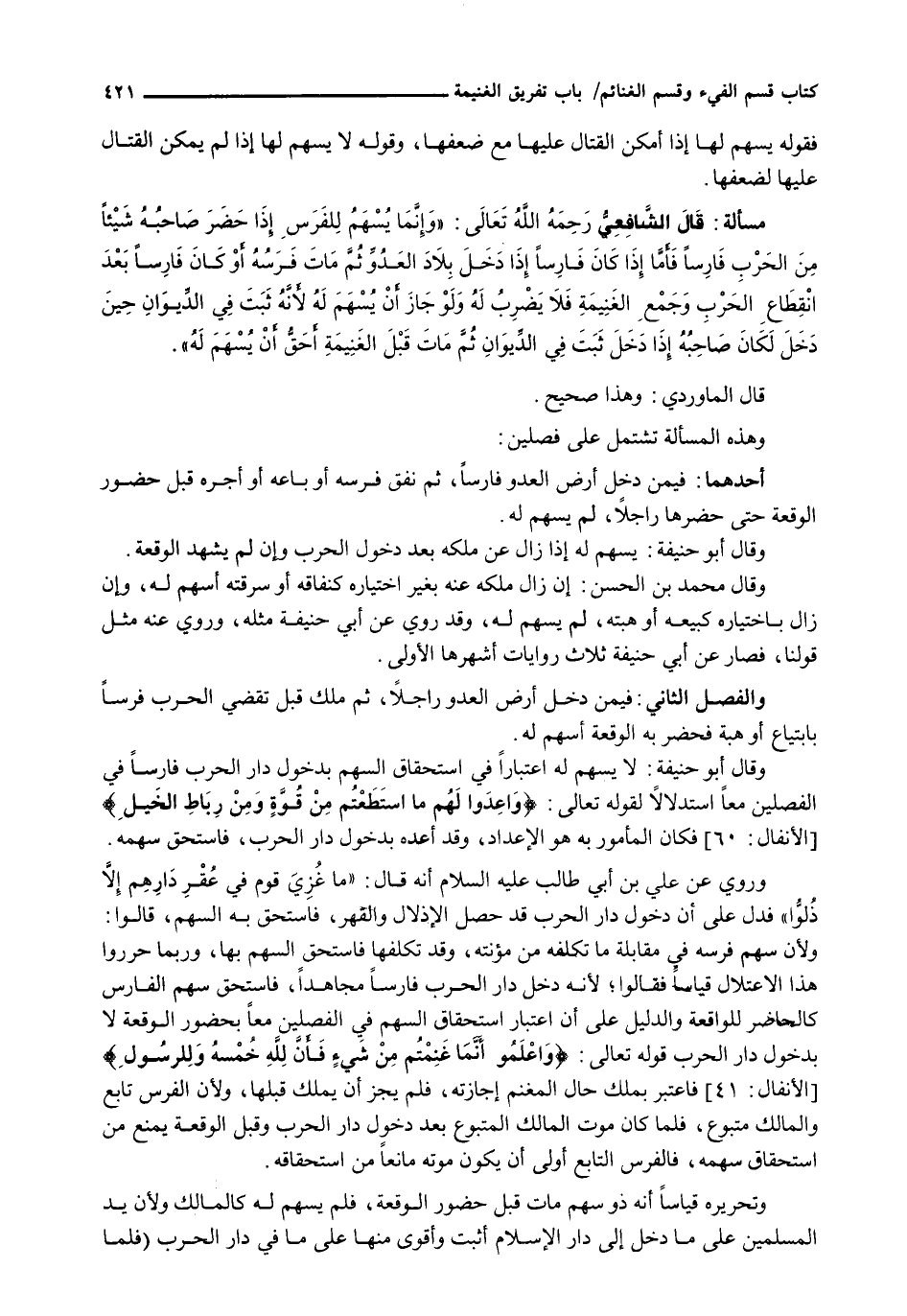 قَالَ الشافعي رحمه الله تعالى: " وَإِنَّمَا يُسْهَمُ لِلْفَرَسِ إِذَا حَضَرَ صَاحِبُهُ شَيْئًا مِنَ الْحَرْبِ فَارِسًا فَأَمَّا إِذَا كَانَ فَارِسًا إِذَا دَخَلَ بِلَادَ الْعَدُوِّ ثُمَّ مَاتَ فَرَسُهُ أَوْ كَانَ فَارِسًا بَعْدَ انْقِطَاعِ الْحَرْبِ وَجَمْعِ الْغَنِيمَةِ فَلَا يُضْرَبُ لَهُ وَلَوْ جَازَ أَنْ يُسْهَمَ لَهُ لِأَنَّهُ ثَبَتَ فِي الدِّيوَانِ حِينَ دَخَلَ لَكَانَ صَاحِبُهُ إِذَا دَخَلَ ثَبَتَ فِي الدِّيوَانِ ثُمَّ مَاتَ قَبْلَ الْغَنِيمَةِ أَحَقُّ أَنْ يُسْهَمَ لَهُ ".