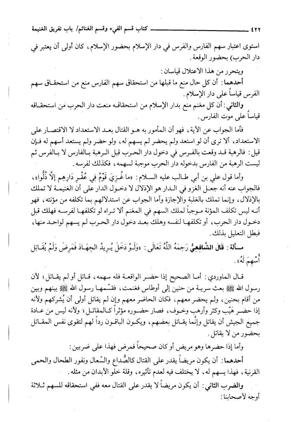 استوى اعتبار سهم الفارس والفرس في دار الإسلام بحضور الإسلام، كان أولى أن يعتبر فِي دَارِ الْحَرْبِ) بِحُضُورِ الْوَقْعَةِ.