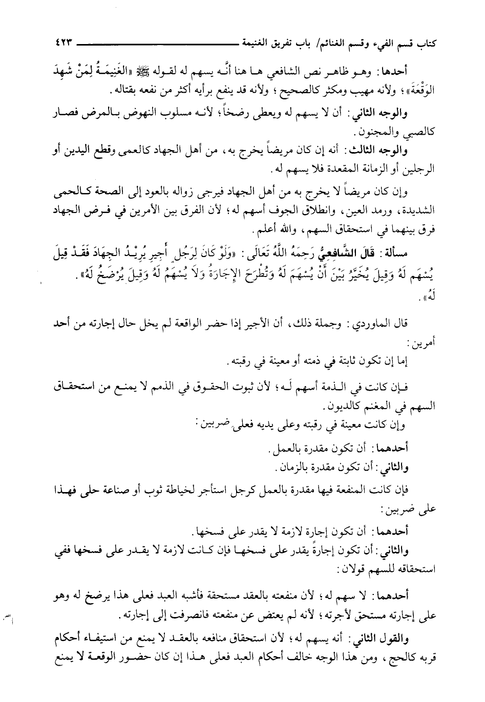 أَحَدُهُمَا: لَا سَهْمَ لَهُ؛ لِأَنَّ مَنْفَعَتَهُ بِالْعَقْدِ مُسْتَحَقَّةٌ فَأَشْبَهَ الْعَبْدَ فَعَلَى هَذَا يُرْضَخُ لَهُ وَهُوَ عَلَى إِجَارَتِهِ مُسْتَحِقٌّ لِأُجْرَتِهِ؛ لِأَنَّهُ لَمْ يَعْتَضْ عَنْ مَنْفَعَتِهِ فَانْصَرَفَتْ إِلَى إِجَارَتِهِ.