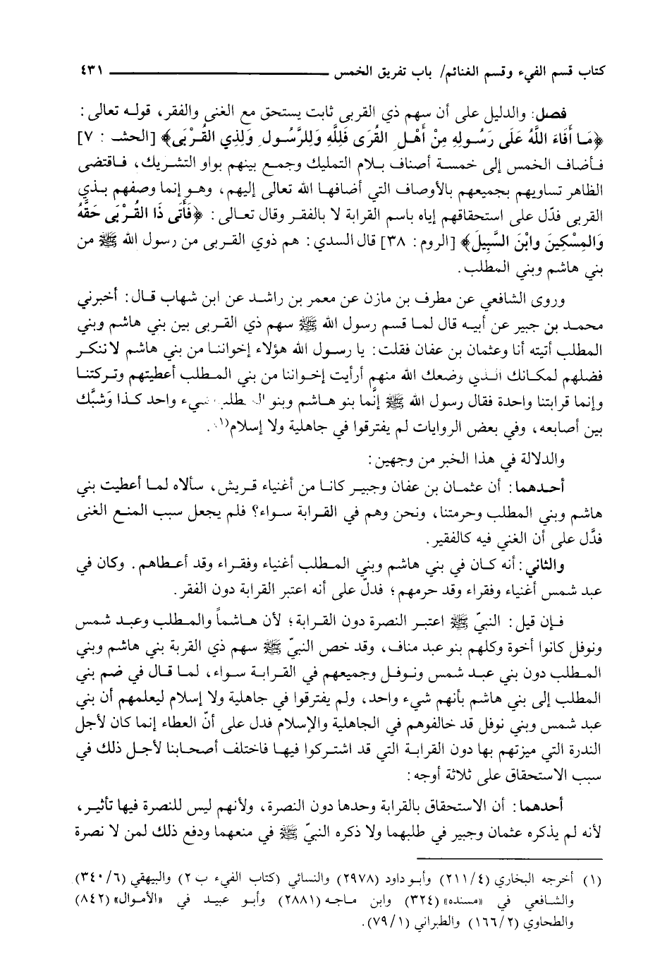 وَالدَّلِيلُ عَلَى أَنَّ سَهْمَ ذِي الْقُرْبَى ثَابِتٌ يُسْتَحَقُّ مَعَ الْغِنَى وَالْفَقْرِ، قَوْله تَعَالَى: {مَا أَفَاءَ اللَّهُ عَلَى رَسُولِهِ مِنْ أَهْلِ الْقُرَى فَلِلَّهِ وَلِلرَّسُولِ وَلِذِي الْقُرْبَى} [الحشر: 7] فَأَضَافَ الْخُمُسَ إِلَى خَمْسَةِ أَصْنَافٍ بِلَامِ التَّمْلِيكِ وَجَمَعَ بَيْنَهُمْ بِوَاوِ التَّشْرِيكِ، فَاقْتَضَى الظَّاهِرُ تَسَاوِيَهُمْ بِجَمِيعِهِمْ بِالْأَوْصَافِ الَّتِي أَضَافَهَا اللَّهُ تَعَالَى إِلَيْهِمْ، وَهُوَ إِنَّمَا وَصَفَهُمْ بِذِي الْقُرْبَى فَدَلَّ عَلَى اسْتِحْقَاقِهِمْ إِيَّاهُ بِاسْمِ الْقَرَابَةِ لَا بِالْفَقْرِ وَقَالَ تَعَالَى: {فأتى ذَا الْقُرْبَى حَقَّهُ وَالْمِسْكِينَ وَابْنَ السَّبِيلِ} [الروم: 38] قَالَ السُّدِّيُّ: هُمْ ذَوِي الْقُرْبَى مِنْ رَسُولِ اللَّهِ - صَلَّى اللَّهُ عَلَيْهِ وَسَلَّم َ - مِنْ بَنِي هَاشِمٍ وَبَنِي الْمُطَّلِبِ.