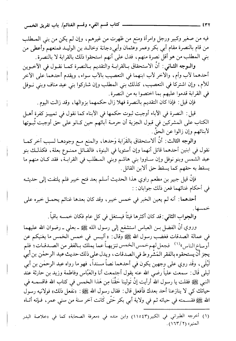 فِيهِ مِنْ صَغِيرٍ وَكَبِيرٍ وَرَجُلٍ وَامْرَأَةٍ وَمَنَعَ مَنْ ظَهَرَتْ مِنْ غَيْرِهِمْ، وَإِنْ لَمْ يَكُنْ مِنْ بَنِي الْمُطَّلِبِ مَنْ قَامَ بِالنُّصْرَةِ مَقَامَ أَبِي بَكْرٍ وَعُمَرَ وَعُثْمَانَ وَأَبِي دُجَانَةَ وَخَالِدِ بْنِ الْوَلِيدِ فَمَنَعَهُمْ وَأَعْطَى مِنْ بَنِي الْمُطَّلِبِ مَنْ هُوَ أَقَلُّ نُصْرَةً مِنْهُمْ، فَدَلَّ عَلَى أَنَّهُمُ اسْتَحَقُّوا ذَلِكَ بِالْقَرَابَةِ لَا بِالنُّصْرَةِ.