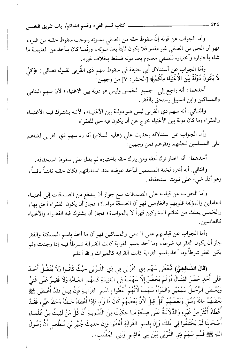 وأما الجواب عن استتدلال أبي حنيفة فِي سُقُوطِ سَهْمِ ذِي الْقُرْبَى لِقَوْلِهِ تَعَالَى: {كَيْ لا يَكُونَ دُولَةً بَيْنَ الأَغْنِيَاءِ مِنْكُمْ} [الحشر: 7] مِنْ وَجْهَيْنِ: