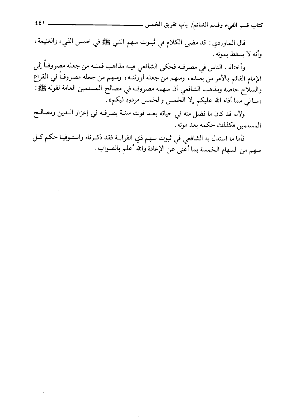 قَالَ الْمَاوَرْدِيُّ: قَدْ مَضَى الْكَلَامُ فِي ثُبُوتِ سهم النبي - صَلَّى اللَّهُ عَلَيْهِ وَسَلَّم َ - فِي خُمُسِ الْفَيْءِ وَالْغَنِيمَةِ، وَأَنَّهُ لَا يَسْقُطُ بِمَوْتِهِ.