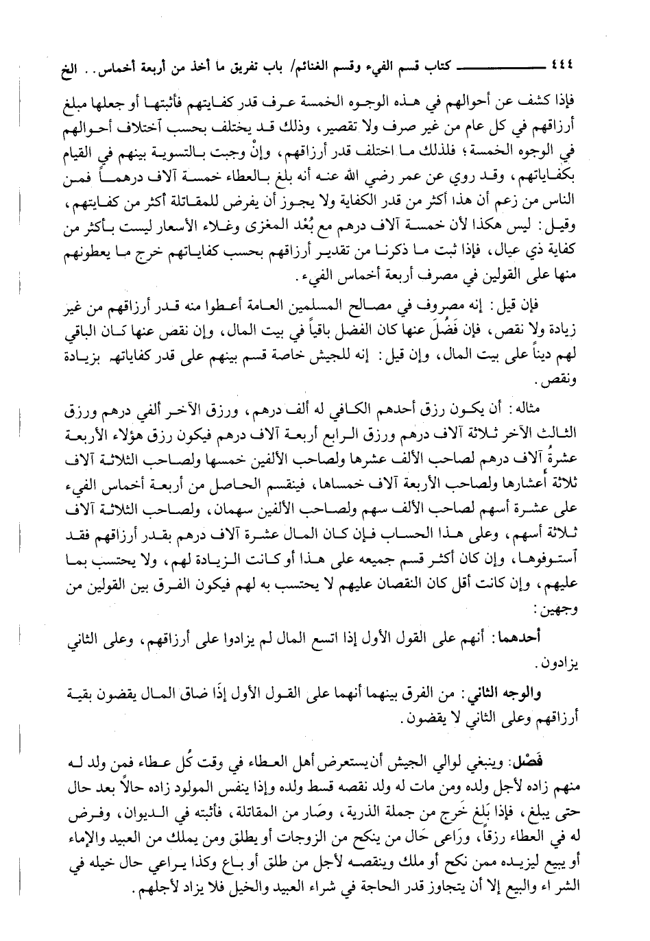 فَإِنْ قِيلَ: إِنَّهُ مَصْرُوفٌ فِي مَصَالِحِ الْمُسْلِمِينَ الْعَامَّةِ أُعْطُوا مِنْهُ قَدْرَ أَرْزَاقِهِمْ مِنْ غَيْرِ زِيَادَةٍ وَلَا نَقْصٍ، فَإِنْ فَضَلَ عَنْهَا كَانَ الْفَضْلُ بَاقِيًا فِي بَيْتِ الْمَالِ، وَإِنْ نَقَصَ عَنْهَا كَانَ الْبَاقِي لَهُمْ دَيْنًا عَلَى بَيْتِ المال، وإن قيل: إن لِلْجَيْشِ خَاصَّةً قُسِمَ بَيْنَهُمْ عَلَى قَدْرِ كِفَايَاتِهِمْ بِزِيَادَةٍ وَنَقْصٍ.