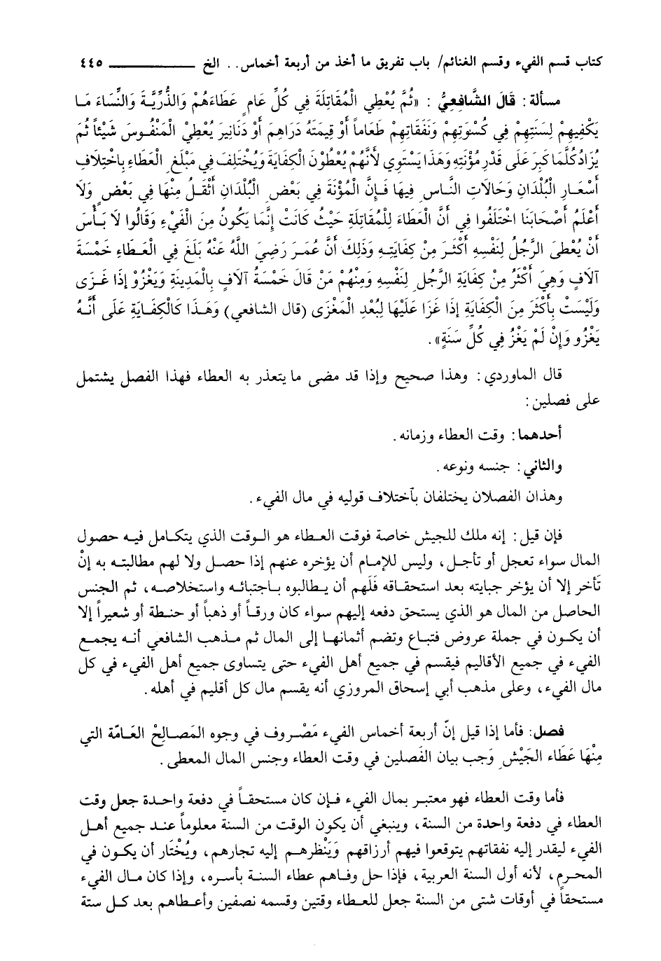 فَأَمَّا إِذَا قِيلَ إِنَّ أَرْبَعَةَ أَخْمَاسِ الْفَيْءِ مَصْرُوفٌ فِي وُجُوهِ الْمَصَالِحِ الْعَامَّةِ الَّتِي مِنْهَا عَطَاءُ الْجَيْشِ وَجَبَ بَيَانُ الْفَصْلَيْنِ فِي وَقْتِ الْعَطَاءِ وَجِنْسِ الْمَالِ الْمُعْطَى.