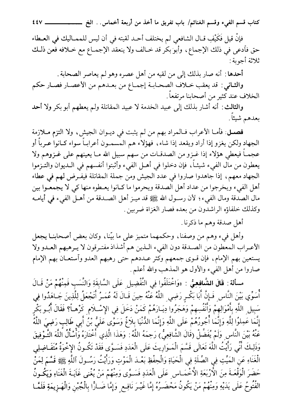 قال الشافعي: " وَاخْتَلَفُوا فِي التَّفْضِيلِ عَلَى السَّابِقَةِ وَالنَّسَبِ فَمِنْهُمْ من قال أسوي بين الناس فإن أبا بكر رضي الله عنه حين قال له عمر أتجعل للذين جاهدوا في سبيل اللَّهِ بِأَمْوَالِهِمْ وَأَنْفُسِهِمْ وَهَجَرُوا دِيَارَهُمْ كَمَنْ دَخَلَ فِي الْإِسْلَامِ كَرْهًا؟ فَقَالَ أَبُو بَكْرٍ إِنَّمَا عَمِلُوا لِلَّهِ وَإِنَّمَا أُجُورُهُمْ عَلَى اللَّهِ وَإِنَّمَا الدنيا بلاغ وسوى علي بن أبي طالب رضي الله عنه بين الناس ولم يفضل (قال الشافعي) رحمه الله: وهذا الذي أختاره وأسأل الله التوفيق وذلك أني رأيت الله تعالى قسم المواريث على العدد فسوى فقد تكون الإخوة متفاضلي الغناء عن الميت في الصلة في الحياة والحفظ بعد الموت وَرَأَيْتُ رَسُولَ اللَّهِ - صَلَّى اللَّهُ عَلَيْهِ وَسَلَّم َ - قسم لمن حضر الوقعة من الأربعة الأخماس على العدد فسوى ومنهم من يغنى غاية الغناء ويكون الفتوح على يديه ومنهم من يكون محضره إما غير نافع وإما ضارا بالجبن والهزيمة فلما