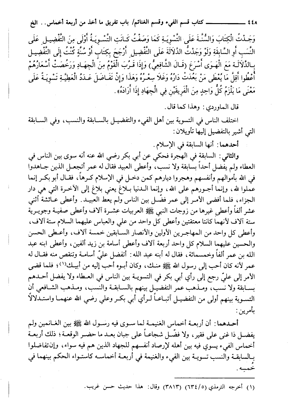 أَحَدُهُمَا: أَنَّ أَرْبَعَةَ أَخْمَاسِ الْغَنِيمَةِ لِمَا سَوَّى فِيهِ رَسُولُ اللَّهِ - صَلَّى اللَّهُ عَلَيْهِ وَسَلَّم َ - بَيْنَ الْغَانِمِينَ وَلَمْ يُفَضِّلْ ذَا غِنًى عَلَى فَقِيرٍ، وَلَا فَضَّلَ شُجَاعًا عَلَى جَبَانٍ بَعْدَ مَا حَضَرَ الْوَقْعَةَ؛ ذَلِكَ أَرْبَعَةُ أَخْمَاسِ الْفَيْءِ يُسَوَّى فِيهِ بَيْنَ أَهْلِهِ لِإِرْصَادِ أَنْفُسِهِمْ لِلْجِهَادِ الَّذِينَ هُمْ فِيهِ سَوَاءٌ، وَإِنْ تَفَاضَلُوا بِالسَّابِقَةِ وَالنَّسَبِ تَسْوِيَةً بَيْنَ الْفَيْءِ وَالْغَنِيمَةِ فِي أَرْبَعَةِ أَخْمَاسِهِ كَاسْتِوَاءِ الْحُكْمِ بَيْنَهُمَا فِي خُمُسِهِ.