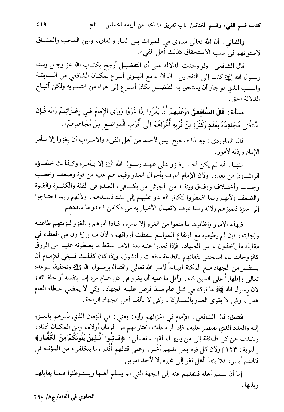 قَالَ الْمَاوَرْدِيُّ: وَهَذَا صَحِيحٌ لَيْسَ لِأَحَدٍ مِنْ أَهْلِ الْفَيْءِ وَالْأَعْرَابِ أَنْ يَغْزُوا إلا بأمر الإمام وإذنه لأمورا مِنْهَا: