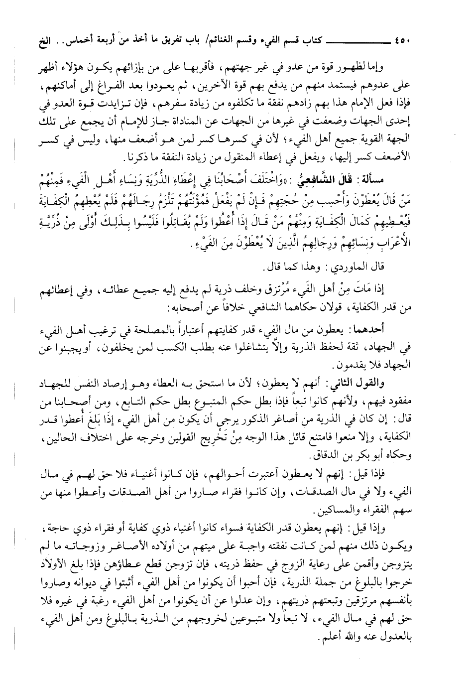 وَإِذَا قِيلَ: إِنَّهُمْ يُعْطَوْنَ قَدْرَ الْكِفَايَةِ فَسَوَاءً كَانُوا أَغْنِيَاءَ ذَوِي كِفَايَةٍ أَوْ فُقَرَاءَ ذَوِي حَاجَةٍ، وَيَكُونُ ذَلِكَ مِنْهُمْ لِمَنْ كَانَتْ نَفَقَتُهُ وَاجِبَةً عَلَى مَيِّتِهِمْ مِنْ أَوْلَادِهِ الْأَصَاغِرِ وَزَوْجَاتِهِ مَا لَمْ يَتَزَوَّجْنَ وَأَقَمْنَ عَلَى رِعَايَةِ الزَّوْجِ فِي حِفْظِ ذُرِّيَّتِهِ، فَإِنْ تَزَوَّجْنَ قُطِعَ عَطَاؤُهُنَّ فَإِذَا بَلَغَ الْأَوْلَادُ خَرَجُوا بِالْبُلُوغِ مِنْ جُمْلَةِ الذُّرِّيَّةِ، فَإِنْ أَحَبُّوا أَنْ يَكُونُوا مِنْ أَهْلِ الْفَيْءِ أُثْبِتُوا فِي دِيوَانِهِ وَصَارُوا بِأَنْفُسِهِمْ مُرْتَزِقِينَ وَتَبِعَتْهُمْ ذُرِّيَّتُهُمْ، وَإِنْ عَدَلُوا عَنْ أَنْ يَكُونُوا مِنْ أَهْلِ الْفَيْءِ رَغْبَةً فِي غَيْرِهِ فَلَا حَقَّ لَهُمْ فِي مَالِ الْفَيْءِ لَا تَبَعًا وَلَا مَتْبُوعِينَ لِخُرُوجِهِمْ مِنَ الذُّرِّيَّةِ بِالْبُلُوغِ وَمِنْ أَهْلِ الْفَيْءِ بِالْعُدُولِ عَنْهُ وَاللَّهُ أعلم.