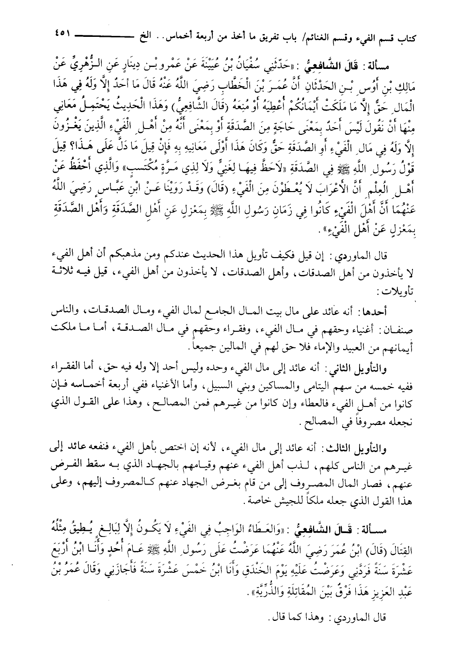 قال الشافعي: " حَدَّثَنِي سُفْيَانَ بْنِ عُيَيْنَةَ عَنْ عَمْرِو بْنِ دِينَارٍ عَنِ الزُّهْرِيِّ عَنْ مَالِكِ بْنِ أَوْسِ بْنِ الْحَدَثَانِ أَنَّ عُمَرَ بْنَ الْخَطَّابِ رَضِيَ اللَّهُ عَنْهُ قَالَ مَا أَحَدٌ إِلَّا وَلَهُ فِي هَذَا الْمَالِ حَقٌّ إِلَّا مَا مَلَكَتْ أيمانكم أعطيه أو منعه (قال الشافعي) وهذا الحديث يحتمل معاني منها أن نقول ليس أحد بمعنى حاجة من الصدقة أو بمعنى أنه من أهل الفيء الذين يغزون إلا وله في مال الفيء أو الصدقة حق وكان هذا أولى معانيه به فإن قيل ما دل على هذا؟ قيل قَوْلُ رَسُولِ اللَّهِ - صَلَّى اللَّهُ عَلَيْهِ وَسَلَّم َ - في الصدقة " لا حظ فيها لغني ولا لذي مرة مكتسب " والذي أحفظ عن أهل العلم أن الأعراب لا يعطون من الفيء (قال) وقد روينا عَنِ ابْنِ عَبَّاسٍ رَضِيَ اللَّهُ عَنْهُمَا أَنَّ أهل الفيء كانوا فِي زَمَانِ رَسُولِ اللَّهِ - صَلَّى اللَّهُ عَلَيْهِ وَسَلَّم َ - بمعزل عن أهل الصدقة وأهل الصدقة بمعزل عن أهل الفيء ".