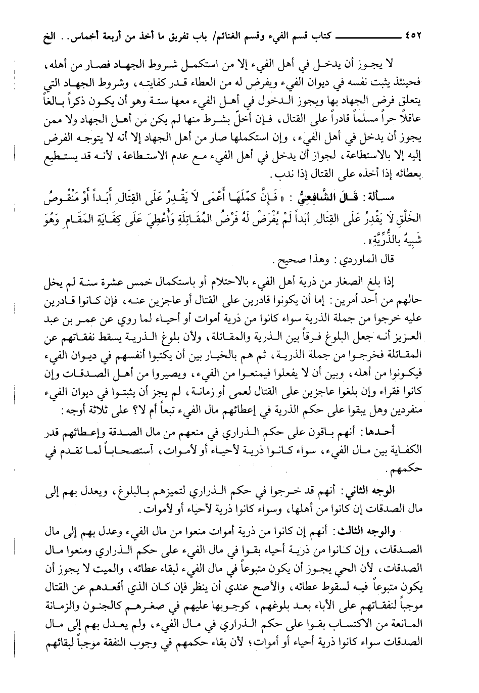 إِذَا بَلَغَ الصِّغَارُ مِنْ ذُرِّيَّةِ أَهْلِ الْفَيْءِ بِالِاحْتِلَامِ أَوْ بِاسْتِكْمَالِ خَمْسَ عَشْرَةَ سَنَةً لَمْ يَخْلُ حَالُهُمْ مِنْ أَحَدِ أَمْرَيْنِ: إِمَّا أَنْ يَكُونُوا قَادِرِينَ عَلَى الْقِتَالِ أَوْ عَاجِزِينَ عَنْهُ، فَإِنْ كَانُوا قَادِرِينَ عَلَيْهِ خَرَجُوا مِنْ جُمْلَةِ الذُّرِّيَّةِ سَوَاءً كَانُوا مِنْ ذُرِّيَّةِ أَمْوَاتٍ أَوْ أَحْيَاءٍ لِمَا رُوِيَ عَنْ عُمَرَ بْنِ عَبْدِ الْعَزِيزِ أَنَّهُ جَعَلَ الْبُلُوغَ فَرْقًا بَيْنَ الذُّرِّيَّةِ وَالْمُقَاتِلَةِ، وَلِأَنَّ بُلُوغَ الذُّرِّيَّةِ يُسْقِطُ نَفَقَاتِهِمْ عَنِ الْمُقَاتِلَةِ فَخَرَجُوا مِنْ جُمْلَةِ الذُّرِّيَّةِ، ثُمَّ هُمْ بِالْخِيَارِ بَيْنَ أَنْ يَكْتُبُوا أَنْفُسَهُمْ فِي دِيوَانِ الْفَيْءِ فَيَكُونُوا مِنْ أَهْلِهِ، وَبَيْنَ أَنْ لَا يَفْعَلُوا فَيُمْنَعُوا مِنَ الْفَيْءِ، وَيَصِيرُوا مِنْ أَهْلِ الصَّدَقَاتِ وَإِنْ كَانُوا فُقَرَاءَ وَإِنْ بَلَغُوا عَاجِزِينَ عَلَى الْقِتَالِ لِعَمًى أَوْ زَمَانَةٍ، لَمْ يَجُزْ أَنْ يُثْبَتُوا فِي دِيوَانِ الْفَيْءِ مُنْفَرِدِينَ وَهَلْ يُبْقَوْا عَلَى حُكْمِ الذُّرِّيَّةِ فِي إِعْطَائِهِمْ مَالَ الْفَيْءِ تَبَعًا أَمْ لَا؟ عَلَى ثَلَاثَةِ أَوْجُهٍ: