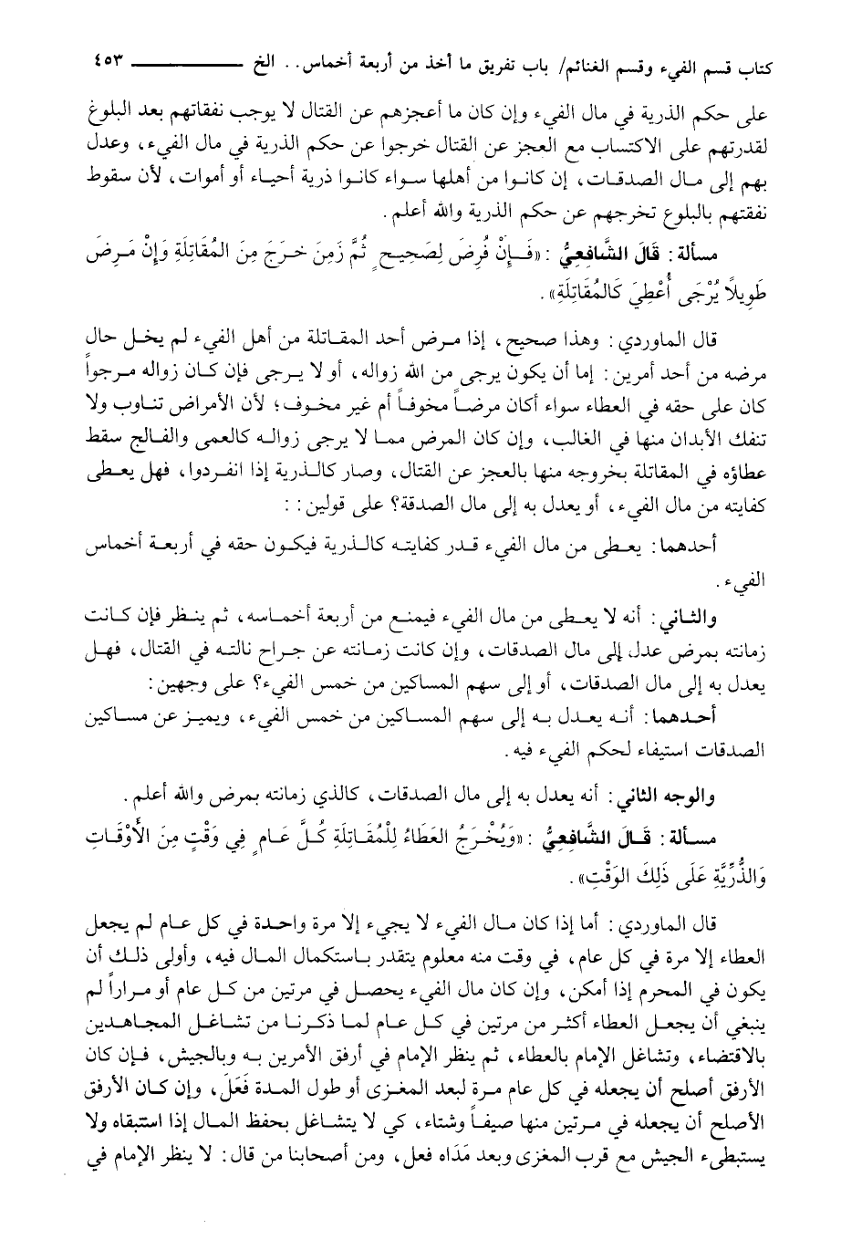 قَالَ الْمَاوَرْدِيُّ: وَهَذَا صَحِيحٌ، إِذَا مَرِضَ أَحَدُ الْمُقَاتِلَةِ مِنْ أَهْلِ الْفَيْءِ لَمْ يَخْلُ حَالُ مَرَضِهِ مِنْ أَحَدِ أَمْرَيْنِ: إِمَّا أَنْ يَكُونَ يجرى مِنَ اللَّهِ زَوَالُهُ، أَوْ لَا يُرْجَى فَإِنْ كَانَ زَوَالُهُ مَرْجُوًّا كَانَ عَلَى حَقِّهِ فِي الْعَطَاءِ سَوَاءً أَكَانَ مَرَضًا مُخَوِّفًا أَمْ غَيْرَ مُخَوِّفٍ؛ لِأَنَّ الْأَمْرَاضَ تَنَاوَبُ وَلَا تَنْفَكُّ الْأَبْدَانُ مِنْهَا فِي الْغَالِبِ، وَإِنْ كَانَ الْمَرَضُ مِمَّا لَا يُرْجَى زَوَالُهُ كَالْعَمَى وَالْفَالَجِ سَقَطَ عَطَاؤُهُ فِي الْمُقَاتِلَةِ بِخُرُوجِهِ مِنْهَا بِالْعَجْزِ عَنِ الْقِتَالِ، وَصَارَ كَالذُّرِّيَّةِ إِذَا انْفَرَدُوا، فَهَلْ يُعْطَى كِفَايَتُهُ مِنْ مَالِ الْفَيْءِ، أَوْ يُعْدَلُ بِهِ إِلَى مَالِ الصَّدَقَةِ؟ عَلَى قَوْلَيْنِ: