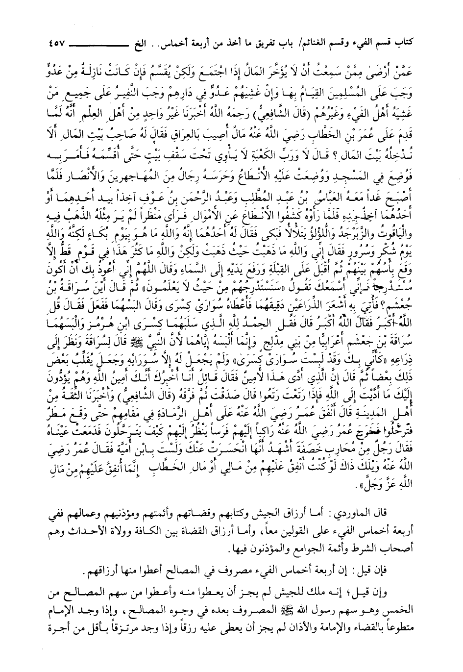عمن أرضى ممن سمعت أن لا يؤخر المال إذا اجتمع ولكن يقسم فإن كانت نازلة من عدو وجب على المسلمين القيام بها وإن غشيهم عدو في دارهم وجب النفير على جميع من غشيه أهل الفيء وغيرهم (قال الشافعي) رحمه الله أخبرنا غير واحد من أهل العلم أنه لما قَدِمَ عَلَى عُمَرَ بْنِ الْخَطَّابِ رَضِيَ اللَّهُ عَنْهُ مال أصيب بالعراق فقال له صاحب بيت المال ألا ندخله بيت المال؟ قال لا ورب الكعبة لا يأوي تحت سقف بيت حتى أقسمه فأمر به فوضع في المسجد ووضعت عليه الأنطاع وحرسه رجال من المهاجرين والأنصار فلما أصبح غدا معه العباس بن عبد المطلب وعبد الرحمن بن عوف آخذا بيد أحدهما أو أحدهما أخذ بيده فلما رأوه كشفوا الأنطاع عن الأموال فرأى منظرا لم ير مثله الذهب فيه والياقوت والزبرجد واللؤلؤ يتلألأ فبكى فقال له أحدهما إنه والله ما هو بيوم بكاء لكنه والله يوم شكر وسرور فقال إني والله ما ذهبت حيث ذهبت ولكن والله ما كثر هذا في قوم قط إلا وقد بأسهم بينهم ثم أقبل على القبلة ورفع يديه إلى السماء وقال اللهم إني أعوذ بك أن أكون مستدرجا فإني أسمعك تقول: " سنستدرجهم من حيث لا يعلمون " ثم قال أين سراقة بن جعشم؟ فأتي به أشعرالذراعين دقيقهما فأعطاه سواري كسرى وقال البسهما ففعل فقال قل الله أكبر فقال الله أكبر قال فقل الحمد لله الذي سلبهما كسرى ابن هرمز ونظر وألبسهما سراقة بن جعشم أعرابيا من بني مدلج، وإنما ألبسه إياهما لأن النبي - صَلَّى اللَّهُ عَلَيْهِ وَسَلَّم َ - قال لسراقة ونظر إلى ذراعه " كأني بك وقد لبست سوارى كسرى " ولم يجعل له إلا سواريه وجعل يقلب بعض ذلك بعضا ثم قال إن الذي أدى هذا لأمين فقال قائل أنا أخبرك أنك أمين الله وهم يؤدون إليك ما أديت إلى الله فإذا رتعت رتعوا قال صدقت ثم فرقه (قال الشافعي) وأخبرنا الثقة من أهل المدينة قال أنفق عمر رضي الله عنه على أهل الرمادة في مقامهم حتى وقع مطر فترحلوا فخرج عمر رضي الله عنه راكبا إليهم فرسا ينظر إليهم كيف يترحلون فدمعت عيناه فقال رجل من محارب خصفة أشهد أنها انحسرت عنك ولست بابن أمية فقال عمر رضي الله عنه ويلك ذاك لو كنت أنفق عليهم من مالي أو مال الخطاب إنما أنفق عليهم من مال الله عز وجل ".