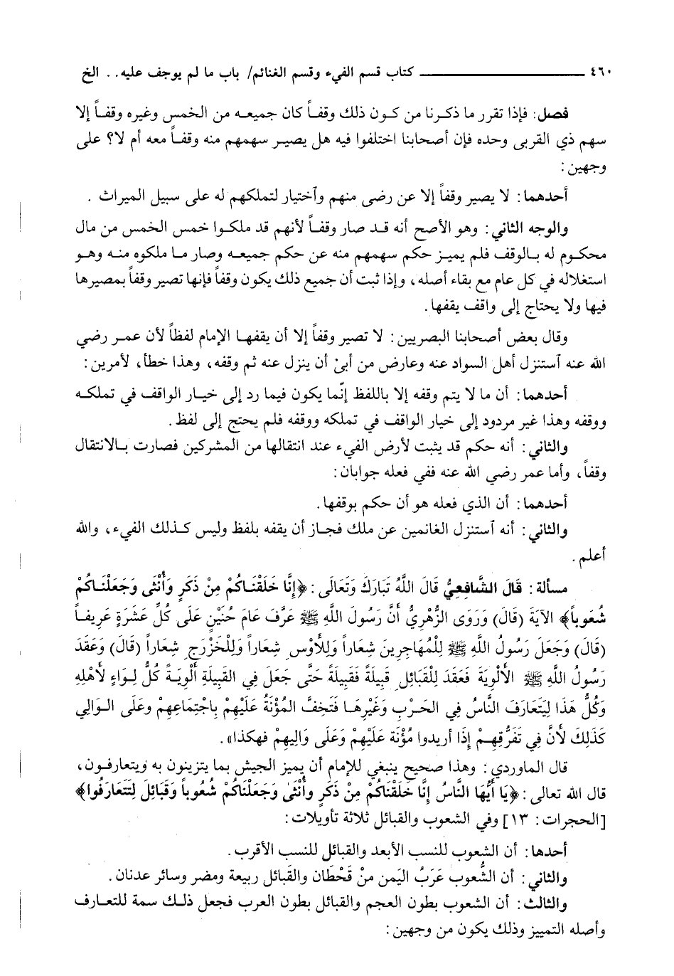 فَإِذَا تَقَرَّرَ مَا ذَكَرْنَا مِنْ كَوْنِ ذَلِكَ وَقْفًا كَانَ جَمِيعُهُ مِنَ الْخُمُسِ وَغَيْرِهِ وَقْفًا إِلَّا سَهْمَ ذِي الْقُرْبَى وَحْدَهُ فَإِنَّ أَصْحَابَنَا اخْتَلَفُوا فِيهِ هَلْ يَصِيرُ سَهْمُهُمْ مِنْهُ وَقْفًا مَعَهُ أَمْ لَا؟ عَلَى وَجْهَيْنِ: