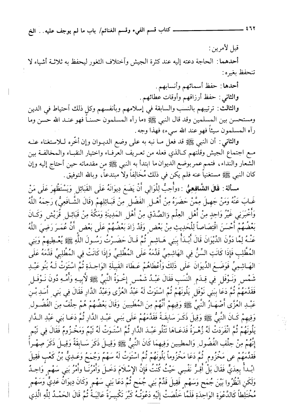 قال الشافعي: " وَأُحِبُّ لِلْوَالِي أَنْ يَضَعَ دِيوَانَهُ عَلَى الْقَبَائِلِ وَيَسْتَظْهِرَ عَلَى مَنْ غَابَ عَنْهُ وَمَنْ جَهِلَ مِمَّنْ حَضَرَهُ مِنْ أَهْلِ الْفَضْلِ مِنْ قَبَائِلِهِمْ (قال الشافعي) رحمه الله وأخبرني غير واحد من أهل العلم والصدق من أهل المدينة ومكة من قبائل قريش وكان بعضهم أحسن اقتصاصا للحديث من بعض وقد زاد بعضهم على بعض أن عمر رضي الله عنه لما دون الديوان قال أبدأ ببني هاشم ثم قال حَضَرْتُ رَسُولَ اللَّهِ - صَلَّى اللَّهُ عَلَيْهِ وَسَلَّم َ - يعطيهم وبني المطلب فإذا كَانَتِ السِّنُّ فِي الْهَاشِمِيِّ قَدَّمَهُ عَلَى الْمُطَّلِبِيِّ وَإِذَا كَانَتْ فِي الْمُطَّلِبِيِّ قَدَّمَهُ عَلَى الْهَاشِمِيِّ فوضع الديوان عَلَى ذَلِكَ وَأَعْطَاهُمْ عَطَاءَ الْقَبِيلَةِ الْوَاحِدَةِ ثُمَّ استوت له بنو عبد شمس ونوفل في قدم النسب فقال عبد شمس إخوة النبي - صَلَّى اللَّهُ عَلَيْهِ وَسَلَّم َ - لأبيه وأمه دون نوفل فقدمهم ثم دعا ببني نوفل يلونهم ثم استوت له عبد العزى وعبد الدار فقال في بني أسد بن عبد العزى أصهار النبي - صَلَّى اللَّهُ عَلَيْهِ وَسَلَّم َ - وفيهم أنهم من المطيبين وقال بعضهم هم حلف من الفضول وفيهم كان النبي - صَلَّى اللَّهُ عَلَيْهِ وَسَلَّم َ - وقيل ذكر سابقة فقدمهم على بني عبد الدار ثم دعا بني عبد الدار يلونهم ثم انفردت له زهرة فدعاها تتلوا عبد الدار ثم استوت له تيم ومخزوم فقال في تيم إنهم من حلف الفضول والمطيبين وفيهما كان النبي - صَلَّى اللَّهُ عَلَيْهِ وَسَلَّم َ - وقيل ذكر سابقة وقيل ذكر صهرا فقدمهم على مخزوم ثم دعا مخزوما يلونهم ثم استوت له سهم وجمح وعدي بن كعب فقيل ابدأ بعدي فَقَالَ بَلْ أُقِرُّ نَفْسِي حَيْثُ كُنْتُ فَإِنَّ الْإِسْلَامَ دَخَلَ وَأَمْرُنَا وَأَمْرُ بَنِي سَهْمٍ وَاحِدٌ ولكن انظروا بين جمح وسهم فقيل قَدَّمَ بَنِي جُمَحَ ثُمَّ دَعَا بَنِي سَهْمٍ وكان ديوانه عدي وسهم مختلطا كالدعوة الواحدة فلما خلصت إِلَيْهِ دَعْوَتُهُ كَبَّرَ تَكْبِيرَةً عَالِيَةً ثُمَّ قَالَ الْحَمْدُ لِلَّهِ الَّذِي
