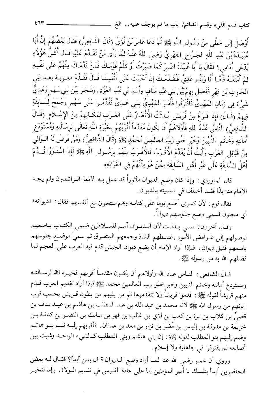 أَوْصَلَ إِلَيَّ حَظِّي مِنْ رَسُولِ اللَّهِ - صَلَّى اللَّهُ عَلَيْهِ وَسَلَّم َ - ثم دعا عامر بن لؤي (قال الشافعي) فقال بعضهم إن أبا عبيدة بن عبد الله الجراح الفهري رضي الله عنه لما رأى من تقدم عليه قال أكل هؤلاء يدعى أمامي؟ فقال يَا أَبَا عُبَيْدَةَ اصْبِرْ كَمَا صَبَرْتُ أَوْ كلم قَوْمَكَ فَمَنْ قَدَّمَكَ مِنْهُمْ عَلَى نَفْسِهِ لَمْ أمنعه فأما أنا وبنو عدي فنقدمك إن أحببت على أنفسنا قال فقدم معوية بعد بني الحارث بن فهر ففصل بهم بين بني عبد مناف وأسد بن عبد العزى وشجر بين بني سهم وعدي شيء فِي زَمَانِ الْمَهْدِيِّ فَافْتَرَقُوا فَأَمَرَ الْمَهْدِيُّ بِبَنِي عَدِيٍّ فَقُدِّمُوا عَلَى سَهْمٍ وجُمَحَ لِسَابِقَةٍ فِيهِمْ (قال) فإذا فرغ من قريش بدئت الأنصار على العرب لمكانهم من الإسلام (قال الشافعي) الناس عباد الله فأولاهم أن يكون مقدما أقربهم بخيرة الله تعالى لِرِسَالَتِهِ وَمُسْتَوْدَعِ أَمَانَتِهِ وَخَاتَمِ النَّبِيِّينَ وَخَيْرِ خَلْقِ رَبِّ الْعَالَمِينَ مُحَمَّدٍ - صَلَّى اللَّهُ عَلَيْهِ وَسَلَّم َ - (قال الشافعي) ومن فرض له الوالي من قبائل العرب رأيت أن يقدم الأقرب فالأقرب منهم برسول الله - صَلَّى اللَّهُ عَلَيْهِ وَسَلَّم َ - فإذا استووا قدم أهل السابقة على غير أهل السابقة ممن هو مثلهم في القرابة ".