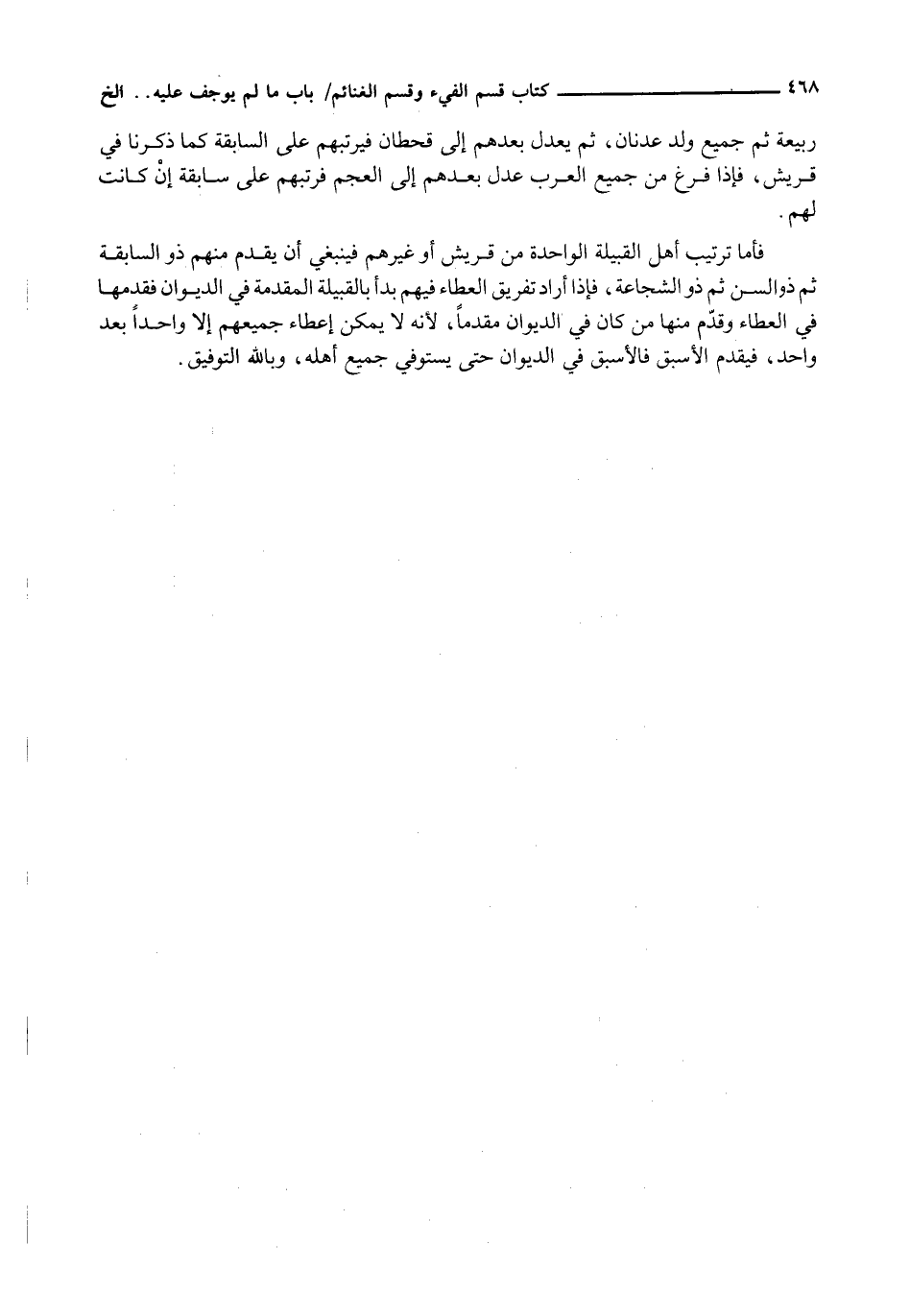 فَأَمَّا تَرْتِيبُ أَهْلِ الْقَبِيلَةِ الْوَاحِدَةِ مِنْ قُرَيْشٍ أَوْ غَيْرِهِمْ فَيَنْبَغِي أَنْ يُقَدَّمَ مِنْهُمْ ذُو السَّابِقَةِ ثُمَّ ذُو السِّنِّ ثُمَّ ذُو الشَّجَاعَةِ، فَإِذَا أَرَادَ تَفْرِيقَ الْعَطَاءِ فِيهِمْ بَدَأَ بِالْقَبِيلَةِ الْمُقَدَّمَةِ فِي الدِّيوَانِ فَقَدَّمَهَا فِي الْعَطَاءِ وَقَدَّمَ مِنْهَا مَنْ كَانَ فِي الدِّيوَانِ مُقَدَّمًا، لِأَنَّهُ لَا يُمْكِنُ إِعْطَاءُ جَمِيعِهِمْ إِلَّا وَاحِدًا بَعْدَ وَاحِدٍ، فَيُقَدِّمُ الْأَسْبَقَ فَالْأَسْبَقَ فِي الدِّيوَانِ حَتَّى يَسْتَوْفِيَ جَمِيعَ أَهْلِهِ، وبالله التوفيق.