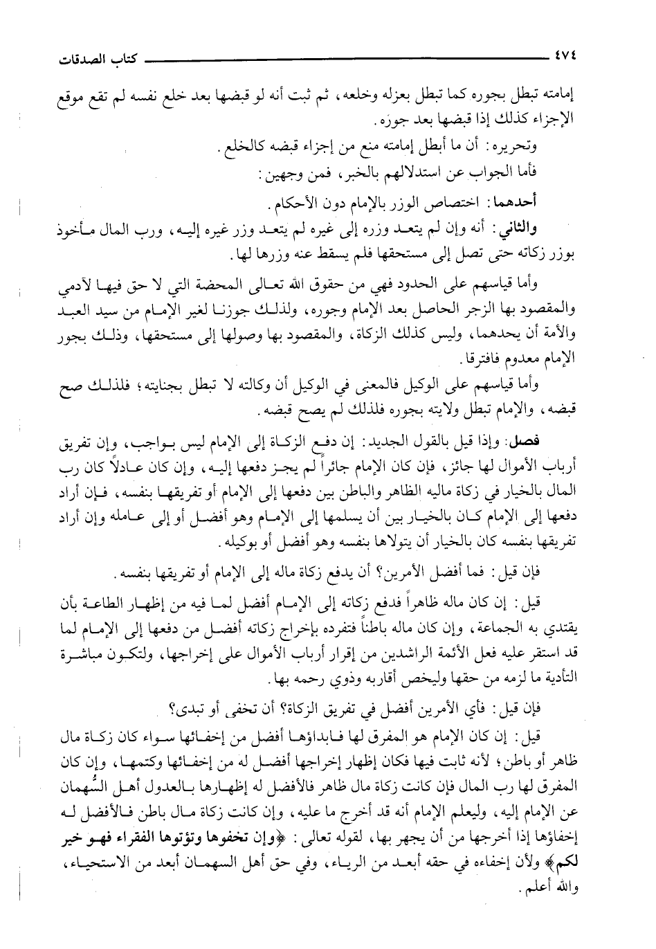 فَإِنْ قِيلَ: فَمَا أَفْضَلُ الْأَمْرَيْنِ؟ أَنْ يَدْفَعَ زكاة ماله إلى الإمام أو تفريقها بِنَفْسِهِ.