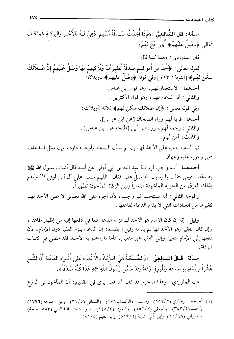 أَحَدُهُمَا: إِنَّهُ وَاجِبٌ لِرِوَايَةِ عَبْدِ اللَّهِ بْنِ أَبِي أَوْفَى عَنْ أَبِيهِ قَالَ أَتَيْتُ رَسُولَ اللَّهِ - صَلَّى اللَّهُ عَلَيْهِ وَسَلَّم َ - بِصَدَقَاتِ قَوْمِي فَقُلْتُ يَا رَسُولَ اللَّهِ صَلِّ علي فقال: اللهم صلي عَلَى آَلِ أَبِي أَوْفَى وَلِيَقَعَ بِذَلِكَ الْفَرْقُ بَيْنَ الْجِزْيَةِ الْمَأْخُوذَةِ صَغَارًا وَبَيْنَ الزَّكَاةِ الْمَأْخُوذَةِ تَطْهِيرًا.