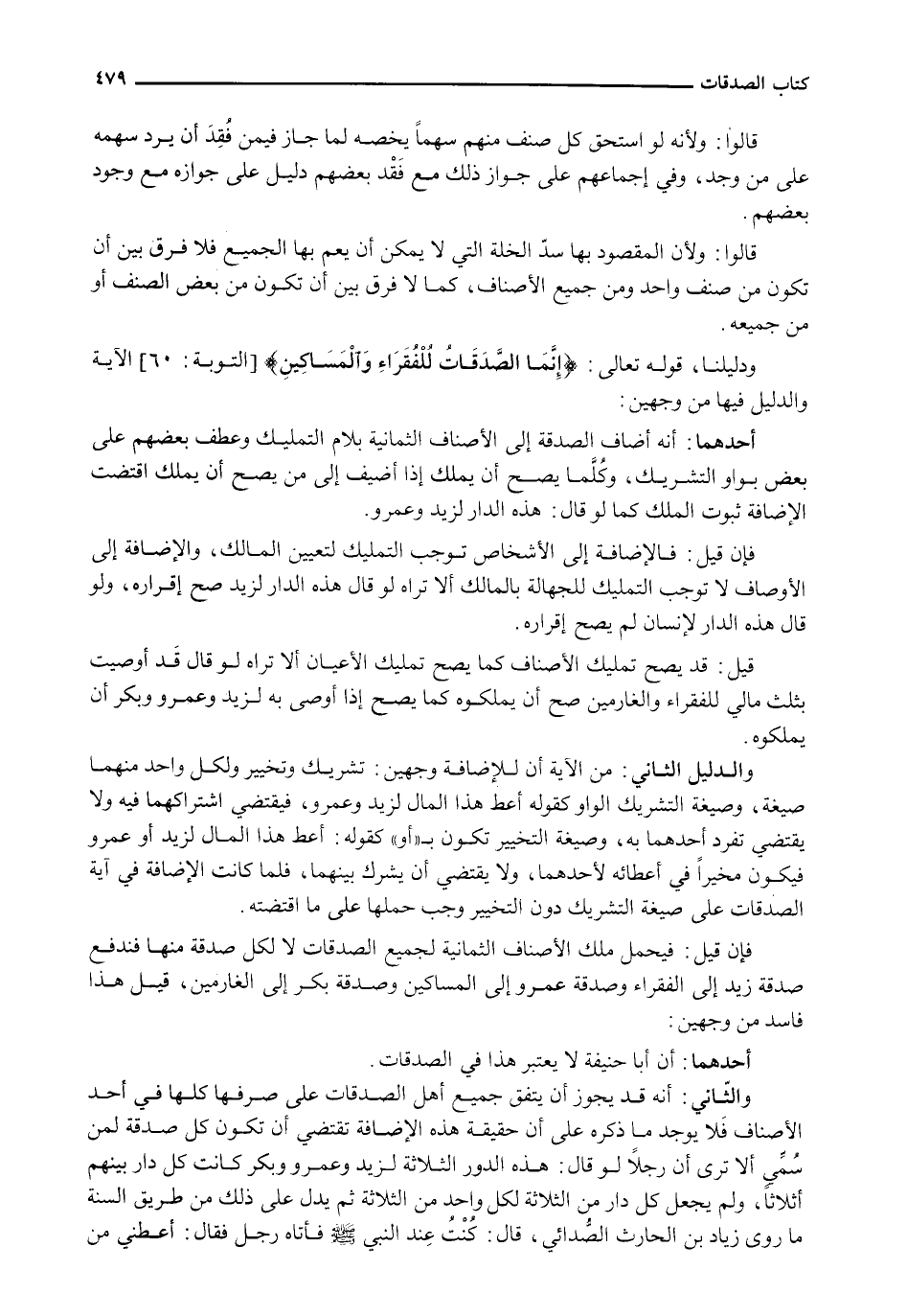 أَحَدُهُمَا: إِنَّهُ أصناف الصدقة إلى الأصناف الثمانية بلا التَّمْلِيكِ وَعَطَفَ بَعْضَهُمْ عَلَى بَعْضٍ بِوَاوِ التَّشْرِيكِ، وَكُلَّمَا يَصِحُّ أَنْ يُمْلَكَ إِذَا أُضِيفَ إِلَى مَنْ يَصِحُّ أَنْ يُمَلَّكَ اقْتَضَتِ الْإِضَافَةُ ثُبُوتَ الْمِلْكِ كَمَا لَوْ قَالَ: هَذِهِ الدَّارُ لِزَيْدٍ وَعَمْرٍو.