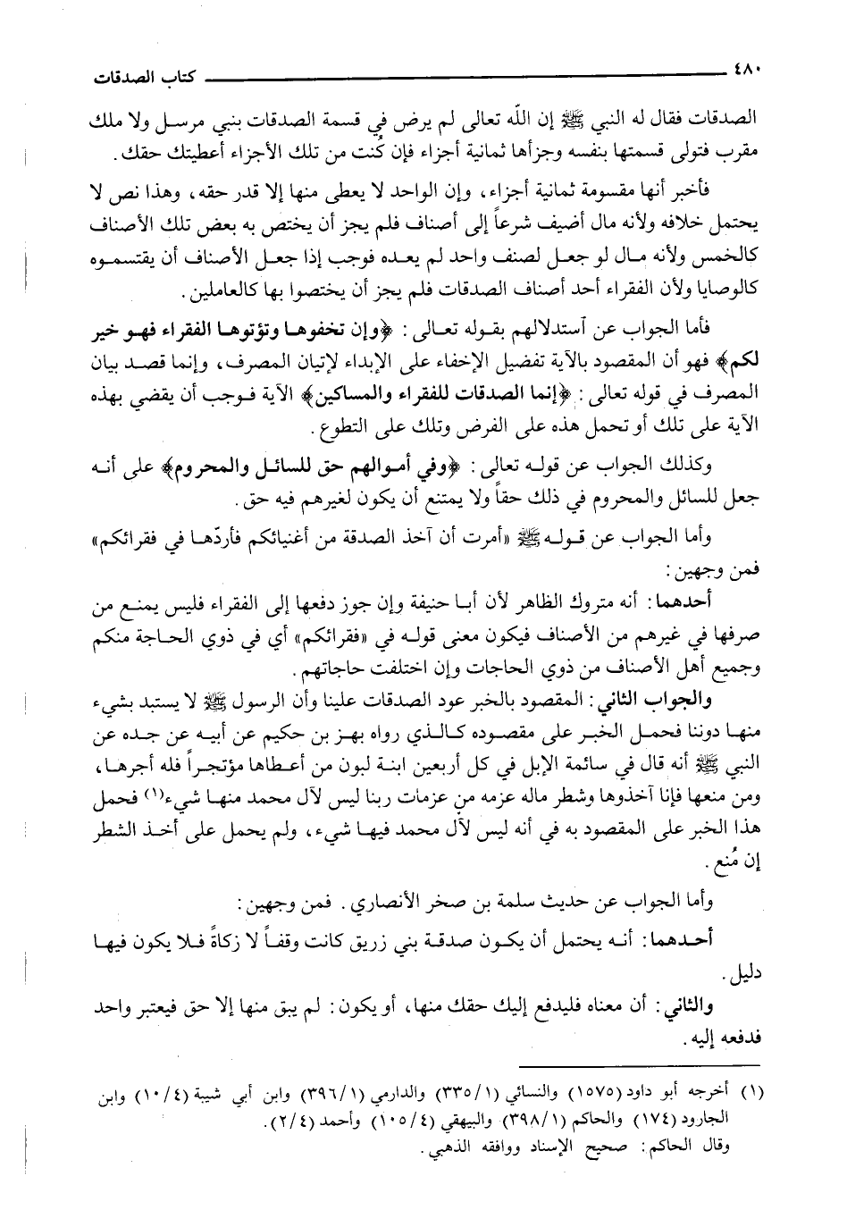 وَأَمَّا الْجَوَابُ عَنْ قَوْلِهِ - صَلَّى اللَّهُ عَلَيْهِ وَسَلَّم َ - " أُمِرْتُ أَنْ آخُذَ الصَّدَقَةَ مِنْ أَغْنِيَائِكُمْ فَأَرُدَّهَا فِي فُقَرَائِكُمْ " فَمِنْ وَجْهَيْنِ: