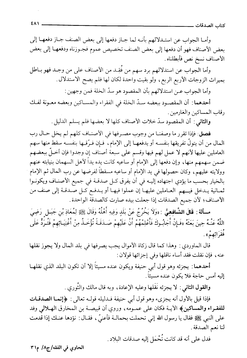 قَالَ الْمَاوَرْدِيُّ: وَهَذَا كَمَا قَالَ زَكَاةُ الْأَمْوَالِ يَجِبُ صَرْفُهَا فِي بَلَدِ الْمَالِ وَلَا يَجُوزُ نَقْلُهَا عَنْهُ، فَإِنْ نُقِلَتْ فَقَدْ أَسَاءَ نَاقِلُهَا وَفِي إِجْزَائِهَا قَوْلَانِ: