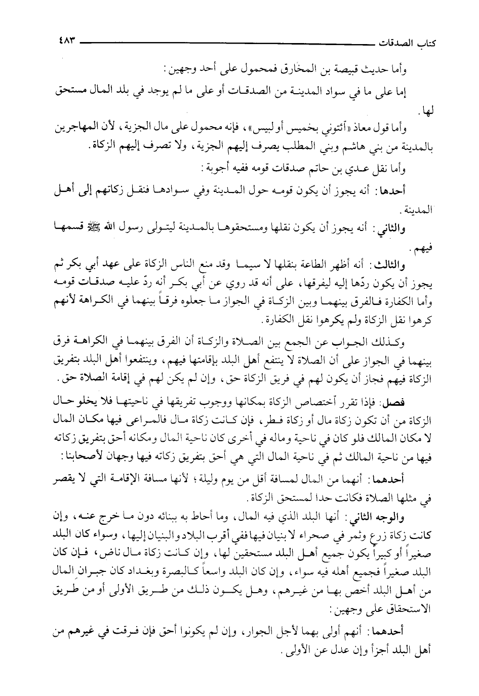 وَالْوَجْهُ الثَّانِي: إِنَّهَا الْبَلَدُ الَّذِي فِيهِ الْمَالُ، وَمَا أَحَاطَ بِهِ بِبِنَائِهِ دُونَ مَا خَرَجَ عَنْهُ، وَإِنْ كَانَتْ زَكَاةَ زَرْعٍ وَثَمَرٍ فِي صَحْرَاءَ لَا بُنْيَانَ فِيهَا فَفِي أَقْرَبِ الْبِلَادِ وَالْبُنْيَانِ إِلَيْهَا، وَسَوَاءً كَانَ الْبَلَدُ صَغِيرًا أَوْ كَبِيرًا يَكُونُ جَمِيعُ أَهْلِ الْبَلَدِ مُسْتَحِقِّينَ لَهَا، وَإِنْ كَانَتْ زَكَاةَ مَالٍ نَاضٍّ، فَإِنْ كَانَ الْبَلَدُ صَغِيرًا فَجَمِيعُ أَهْلِهِ فِيهِ سَوَاءٌ، وَإِنْ كَانَ الْبَلَدُ وَاسِعًا كالبصرة وبغداد كان جبران الْمَالِ مِنْ أَهْلِ الْبَلَدِ أَخَصَّ بِهَا مِنْ غَيْرِهِمْ، وَهَلْ يَكُونُ ذَلِكَ مِنْ طَرِيقِ الْأَوْلَى أَوْ مِنْ طَرِيقِ الِاسْتِحْقَاقِ عَلَى وَجْهَيْنِ: