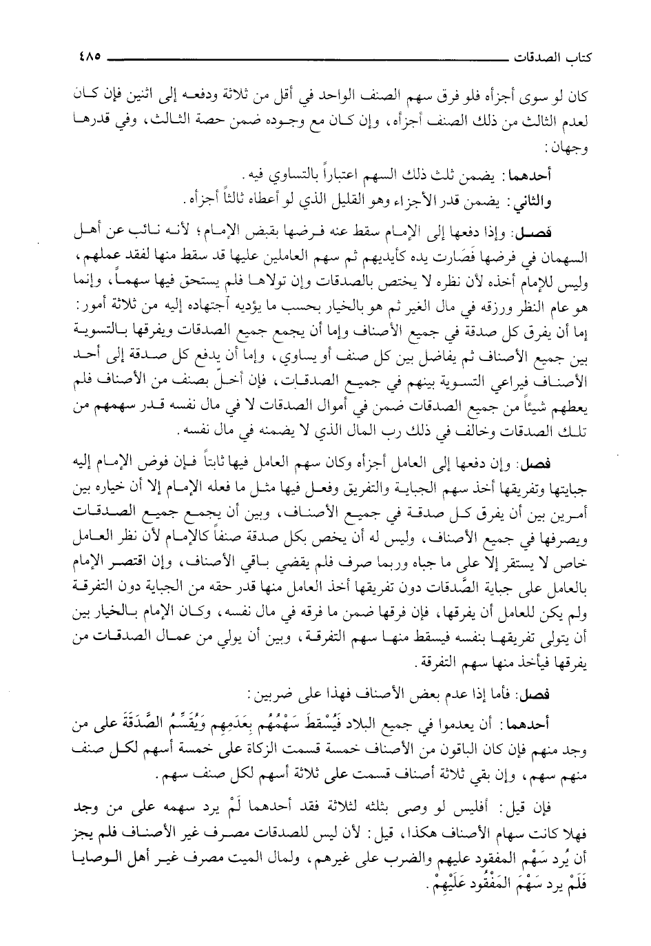 وَإِذَا دَفَعَهَا إِلَى الْإِمَامِ سَقَطَ عَنْهُ فَرْضُهَا بِقَبْضِ الْإِمَامِ؛ لِأَنَّهُ نَائِبٌ عَنْ أَهْلِ السُّهْمَانِ فِي فَرْضِهَا فَصَارَتْ يَدُهُ كَأَيْدِيهِمْ ثُمَّ سَهْمُ الْعَامِلِينَ عَلَيْهَا قَدْ سَقَطَ مِنْهَا لِفَقْدِ عَمَلِهِمْ، وَلَيْسَ لِلْإِمَامِ أَخْذُهُ لِأَنَّ نَظَرَهُ لَا يَخْتَصُّ بِالصَّدَقَاتِ وَإِنْ تَوَلَّاهَا فَلَمْ يَسْتَحِقَّ فِيهَا سَهْمًا، وَإِنَّمَا هُوَ عَامُّ النَّظَرِ وَرِزْقُهُ فِي مَالِ الْغَيْرِ ثُمَّ هُوَ بِالْخِيَارِ بِحَسَبِ مَا يُؤَدِّيهِ اجْتِهَادُهُ إِلَيْهِ مِنْ ثَلَاثَةِ أُمُورٍ: إِمَّا أَنْ يُفَرِّقَ كُلَّ صَدَقَةٍ فِي جَمِيعِ الْأَصْنَافِ وَإِمَّا أَنْ يَجْمَعَ جَمِيعَ الصَّدَقَاتِ وَيُفَرِّقَهَا بِالتَّسْوِيَةِ بَيْنَ جَمِيعِ الْأَصْنَافِ ثُمَّ يُفَاضِلُ بَيْنَ كُلِّ صِنْفٍ أَوْ يُسَاوِي، وَإِمَّا أَنْ يَدْفَعَ كُلَّ صَدَقَةٍ إِلَى أَحَدِ الْأَصْنَافِ فَيُرَاعِي التَّسْوِيَةَ بَيْنَهُمْ فِي جَمِيعِ الصَّدَقَاتِ، فَإِنْ أَخَلَّ بِصِنْفٍ مِنَ الْأَصْنَافِ فَلَمْ يُعْطِهِمْ شَيْئًا مِنْ جَمِيعِ الصَّدَقَاتِ ضَمِنَ فِي أَمْوَالِ الصَّدَقَاتِ لَا فِي مَالِ نَفْسِهِ قَدْرَ سَهْمِهِمْ من تلك الصدقات وخالف في ذلك رب المال الذي لا يضمنه في مال نفسه.