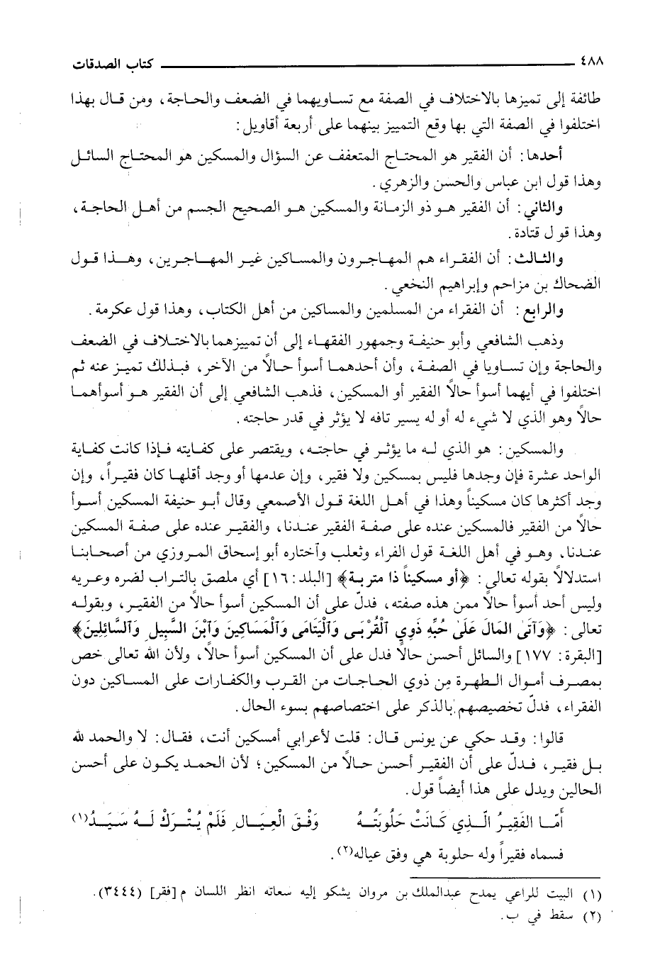 وَالْمِسْكِينُ: هُوَ الَّذِي لَهُ مَا يُؤَثِّرُ فِي حَاجَتِهِ، وَيَقْتَصِرُ عَلَى كِفَايَتِهِ فَإِذَا كَانَتْ كِفَايَةُ الْوَاحِدِ عَشَرَةً فَإِنْ وَجَدَهَا فَلَيْسَ بِمِسْكِينٍ وَلَا فَقِيرٍ، وَإِنْ عَدِمَهَا أَوْ وَجَدَ أَقَلَّهَا كَانَ فَقِيرًا، وَإِنْ وَجَدَ أَكْثَرَهَا كَانَ مِسْكِينًا وَهَذَا فِي أَهْلِ اللُّغَةِ قَوْلُ الْأَصْمَعِيِّ وَقَالَ أبو حنيفة الْمِسْكِينُ أَسْوَأُ حَالًا مِنَ الْفَقِيرِ فَالْمِسْكِينُ عِنْدَهُ عَلَى صِفَةِ الْفَقِيرِ عِنْدَنَا، وَالْفَقِيرُ عِنْدَهُ عَلَى صِفَةِ الْمِسْكِينِ عِنْدَنَا، وَهُوَ فِي أَهْلِ اللُّغَةِ قَوْلُ الْفَرَّاءِ وَثَعْلَبٍ وَاخْتَارَهُ أَبُو إِسْحَاقَ الْمَرْوَزِيُّ مِنْ أَصْحَابِنَا اسْتِدْلَالًا بِقَوْلِهِ تَعَالَى: {أَوْ مِسْكِينًا ذَا مَتْرَبَةٍ} [البلد: 16] أي ملصق بِالتُّرَابِ لِضُرِّهِ وَعُرْيِهِ وَلَيْسَ أَحَدٌ أَسْوَأَ حَالًا مِمَّنْ هَذِهِ صِفَتُهُ، فَدَلَّ عَلَى أَنَّ الْمِسْكِينَ أَسْوَأُ حَالًا مِنَ الْفَقِيرِ، وَبِقَوْلِهِ تَعَالَى: {وَآتَى الْمَالَ عَلَى حُبِّهِ ذَوِي الْقُرْبَى وَالْيَتَامَى وَالْمَسَاكِينَ وَابْنَ السَّبِيلِ وَالسَّائِلِينَ} [البقرة: 177] وَالسَّائِلُ أَحْسَنُ حَالًا فَدَلَّ عَلَى أَنَّ الْمِسْكِينَ أَسْوَأُ حَالًا، وَلِأَنَّ اللَّهَ تَعَالَى خَصَّ بِمَصْرِفِ أَمْوَالِ الطُّهْرَةِ مِنْ ذَوِي الْحَاجَاتِ مِنَ الْقُرَبِ وَالْكَفَّارَاتِ عَلَى الْمَسَاكِينِ دُونَ الْفُقَرَاءِ، فَدَلَّ تَخْصِيصُهُمْ بِالذِّكْرِ عَلَى اخْتِصَاصِهِمْ بسوء الحال.