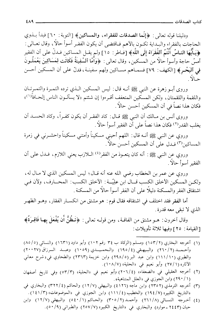 وروى أبو زهرة عن النبي - صَلَّى اللَّهُ عَلَيْهِ وَسَلَّم َ - أَنَّهُ قَالَ: لَيْسَ الْمِسْكِينُ الَّذِي تَرُدُّهُ التَّمْرَةُ والتمرتان واللقمة واللقمتان، ولكن المسكين المتعفف أقراءوا إن شئتم " لا يسألون الناس إلحافا " فَكَانَ هَذَا نَصًّا فِي أَنَّ الْمِسْكِينَ أَحْسَنُ حَالًا.