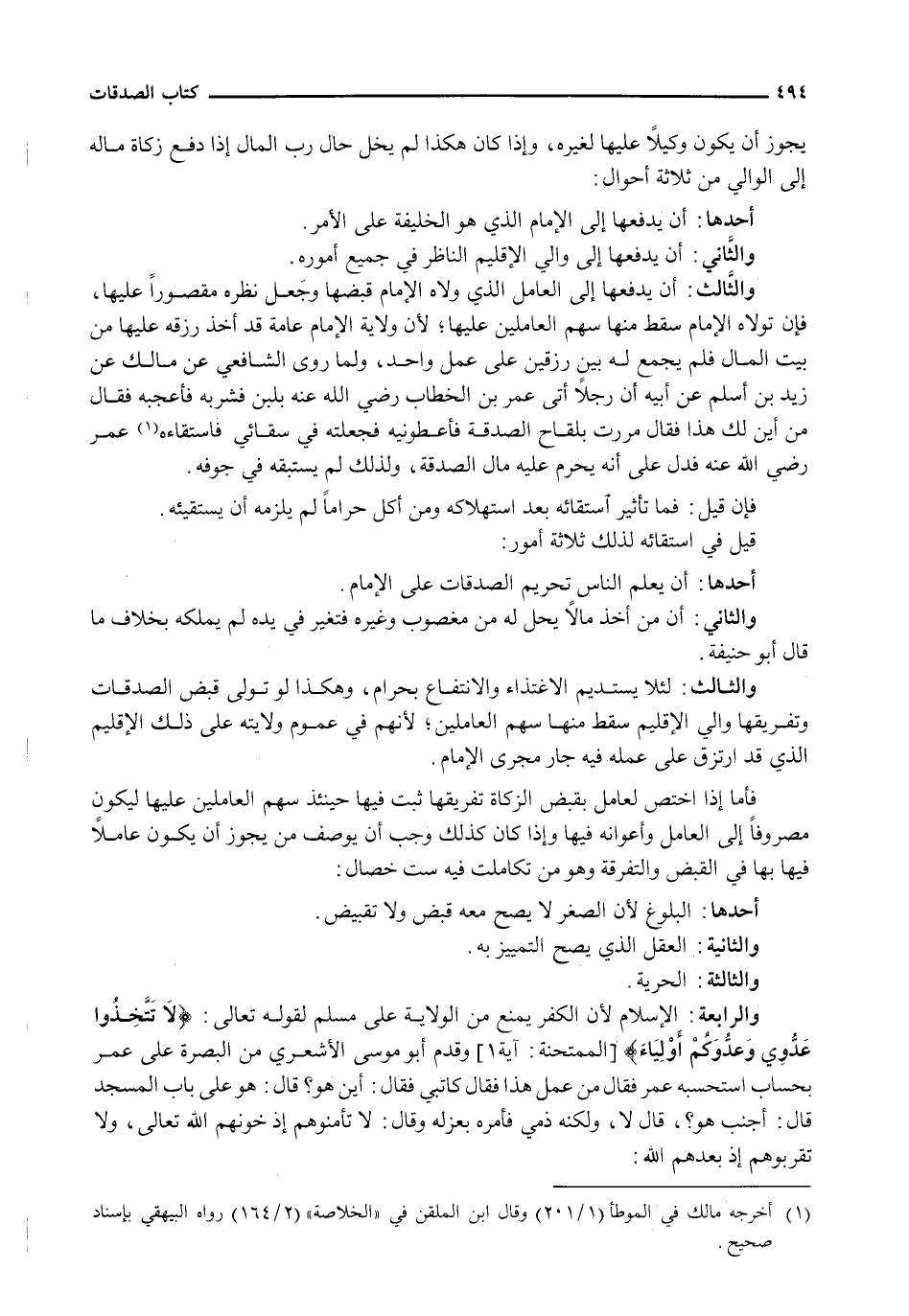 وَالثَّالِثُ: أَنْ يَدْفَعَهَا إِلَى الْعَامِلِ الَّذِي وَلَّاهُ الْإِمَامُ قَبْضَهَا وَجَعَلَ نَظَرَهُ مَقْصُورًا عَلَيْهَا، فَإِنْ تَوَلَّاهُ الْإِمَامُ سَقَطَ مِنْهَا سَهْمُ الْعَامِلِينَ عَلَيْهَا؛ لِأَنَّ وِلَايَةَ الْإِمَامِ عَامَّةٌ قَدْ أَخَذَ رِزْقَهُ عَلَيْهَا مِنْ بَيْتِ الْمَالِ فَلَمْ يُجْمَعْ لَهُ بَيْنَ رِزْقَيْنِ عَلَى عَمَلٍ وَاحِدٍ، وَلِمَا رَوَى الشَّافِعِيُّ عَنْ مَالِكٍ عَنْ زَيْدِ بْنِ أَسْلَمَ عَنْ أَبِيهِ أَنَّ رَجُلًا أَتَى عُمَرَ بْنَ الْخَطَّابِ رَضِيَ اللَّهُ عَنْهُ بِلَبَنٍ فَشَرِبَهُ فَأَعْجَبَهُ فَقَالَ مِنْ أَيْنَ لَكَ هَذَا فَقَالَ مَرَرْتُ بِلِقَاحِ الصَّدَقَةِ فَأَعْطَوْنِيهِ فَجَعَلْتُهُ فِي سِقَائِي فَاسْتَقَاءَهُ عُمَرُ رَضِيَ اللَّهُ عَنْهُ فَدَلَّ عَلَى أَنَّهُ يَحْرُمُ عَلَيْهِ مَالُ الصَّدَقَةِ، وَلِذَلِكَ لَمْ يَسْتَبْقِهِ فِي جَوْفِهِ.