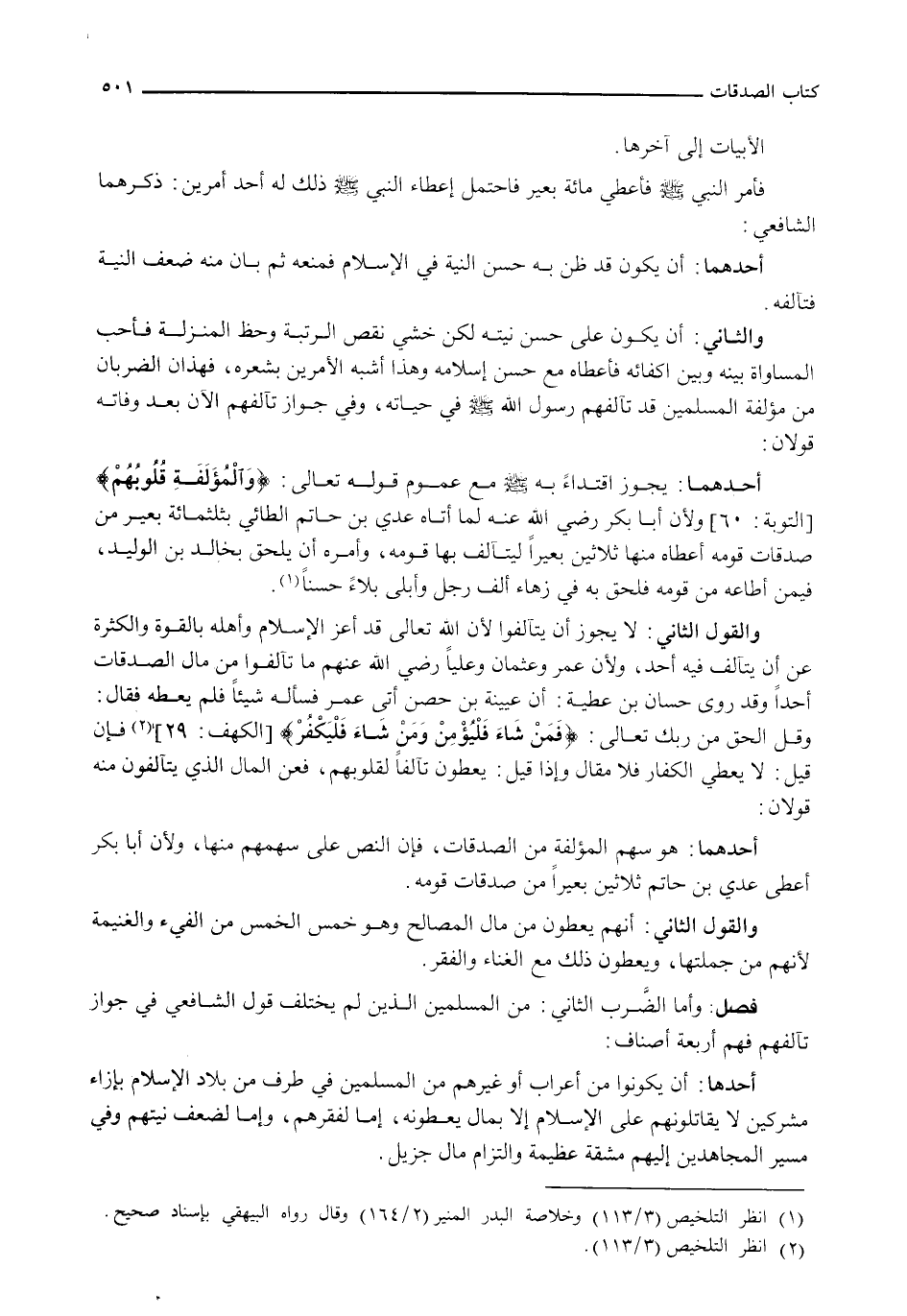 وَالثَّانِي: أَنْ يَكُونَ عَلَى حُسْنِ نيته لكن خشي نقص الرتبة وحظ الْمَنْزِلَةِ فَأَحَبَّ الْمُسَاوَاةَ بَيْنَهُ وَبَيْنَ أَكْفَائِهِ فَأَعْطَاهُ مَعَ حُسْنِ إِسْلَامِهِ وَهَذَا أَشْبَهُ الْأَمْرَيْنِ بِشِعْرِهِ، فَهَذَانِ الضَّرْبَانِ مِنْ مُؤَلَّفَةِ الْمُسْلِمِينَ قَدْ تَآلَفَهُمْ رسول الله - صَلَّى اللَّهُ عَلَيْهِ وَسَلَّم َ - فِي حَيَاتِهِ، وَفِي جَوَازِ تَآلُفِهِمُ الْآنَ بَعْدَ وَفَاتِهِ قَوْلَانِ:
