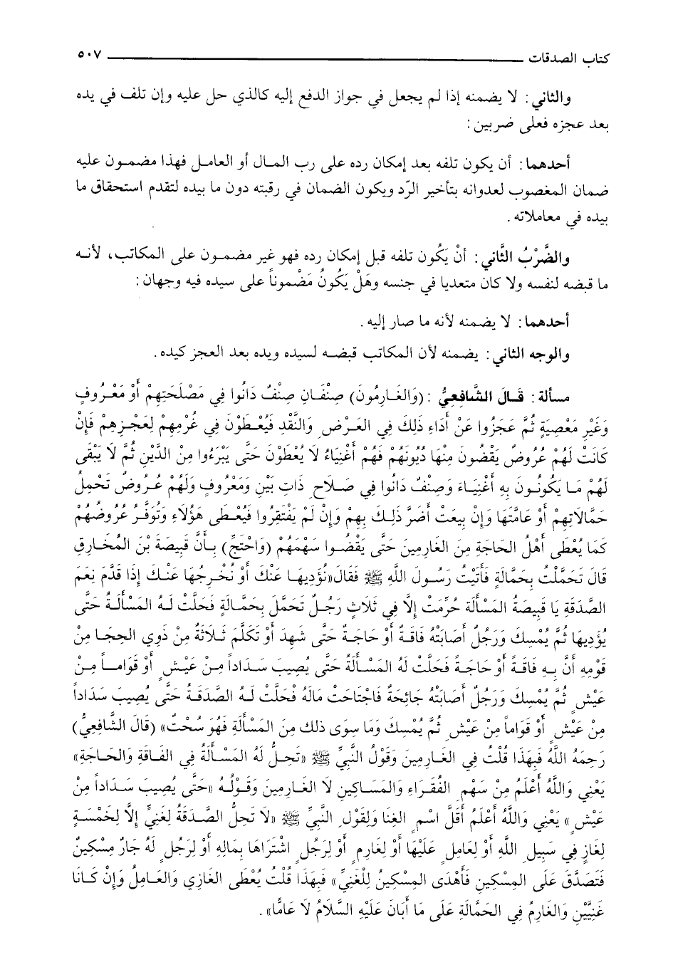 قال الشافعي: (وَالْغَارِمُونَ) صِنْفَانِ صِنْفٌ دَانُوا فِي مَصْلَحَتِهِمْ أَوْ مَعْرُوفٍ وَغَيْرِ مَعْصِيَةٍ ثُمَّ عَجَزُوا عَنْ أَدَاءِ ذَلِكَ فِي الْعَرْضِ وَالنَّقْدِ فَيُعْطَوْنَ فِي غُرْمِهِمْ لعجزهم فإن كانت لهم عروض يقضون منها ديونهم فهم أغنياء لا يعطون حتى يبرءوا من الدين ثم لا يبقى لهم ما يكونون به أغنياء وصنف دانوا في صلاح ذات بين ومعروف ولهم عروض تحمل حمّالاتهم أو عامتها وإن بيعت أضر ذلك بهم وإن لم يفتقروا فيعطى هؤلاء وتوفر عروضهم كما يعطى أهل الحاجة من الغارمين حتى يقضوا سهمهم (واحتج) بأن قبيصة بن المخارق قال تحملت بحمالة فَأَتَيْتُ رَسُولَ اللَّهِ - صَلَّى اللَّهُ عَلَيْهِ وَسَلَّم َ - فقال: " نؤديها عنك أو نخرجها عنك إذا قدم نعم الصدقة يا قبيصة " الْمَسْأَلَةَ حُرِّمَتْ إِلَّا فِي ثَلَاثٍ رَجُلٍ تَحَمَّلَ بِحَمَالَةٍ فَحَلَّتْ لَهُ الْمَسْأَلَةُ حَتَّى يُؤَدِّيَهَا ثُمَّ يمسك ورجل أصابته فاقة أو حاجة حتى شهد أو تكلم ثلاثة من ذوي الحِجا من قومه أن به فاقة أو حاجة فحلت له المسألة حتى يصيب سدادا من عيش أو قَوَامًا مِنْ عَيْشٍ ثُمَّ يُمْسِكُ وَرَجُلٍ أَصَابَتْهُ جائحة فاجتاحت ماله فحلت له الصدقة حتى يصيب سدادا من عيش أو قَوَامًا مِنْ عَيْشٍ ثُمَّ يُمْسِكُ وَمَا سِوَى ذلك من المسألة فهو سحت " (قال الشافعي) رحمه الله: فبهذا قلت في الغارمين وقول النبي - صَلَّى اللَّهُ عَلَيْهِ وَسَلَّم َ - " تحل له المسألة في الفاقة والحاجة " يعني والله أعلم من سهم الفقراء والمساكين لا الغارمين وقوله " حتى يصيب سدادا من عيش " يعني والله أعلم أقل اسم الغنا ولقول النبي - صَلَّى اللَّهُ عَلَيْهِ وَسَلَّم َ - " لَا تَحِلُّ الصَّدَقَةُ لِغَنِيٍّ إِلَّا لِخَمْسَةٍ لِغَازٍ فِي سَبِيلِ اللَّهِ أَوْ لِعَامِلٍ عَلَيْهَا أَوْ لغارم أو لرجل اشتراها بماله أَوْ لِرَجُلٍ لَهُ جَارٌ مِسْكِينٌ فَتَصَدَّقَ عَلَى المسكين فأهدى المسكين للغني " فبهذا قلت يعطى الغازي والعامل وإن كانا غنيين والغارم في الحمالة على ما أبان عليه السلام لا عاما ".