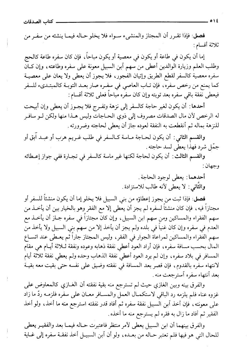 فَإِذَا ثَبَتَ مَنْ يَجُوزُ إِعْطَاؤُهُ مَنْ بَنِي السَّبِيلِ فَلَا يَخْلُو إِمَّا أَنْ يَكُونَ مُنْشِئًا لِلسَّفَرِ أَوْ مُجْتَازًا فِيهِ، فَإِنْ كَانَ مُنْشِئًا لِسَفَرِهِ لَمْ يَجُزْ أَنْ يُعْطَى إِلَّا مَعَ الْفَقْرِ وَهُوَ بِالْخِيَارِ بَيْنَ أَنْ يَأْخُذَ مِنْ سَهْمِ الْفُقَرَاءِ وَالْمَسَاكِينِ وَمِنِ سَهْمِ ابْنِ السَّبِيلِ، وَإِنْ كَانَ مُجْتَازًا فِي سَفَرِهِ جَازَ أَنْ يَأْخُذَ مَعَ الْعَدَمِ فِي سَفَرِهِ وَإِنْ كَانَ غَنِيًّا فِي بَلَدِهِ وَلَمْ يَجُزْ أَنْ يَأْخُذَ إِلَّا مِنْ سَهْمِ بَنِي السَّبِيلِ وَلَا يَأْخُذُ مِنْ سَهْمِ الْفُقَرَاءِ وَالْمَسَاكِينِ لِمُرَاعَاةِ الْجِوَارِ فِي الْفَقْرِ، وَلَيْسَ الْمُجْتَازُ جَارًا ثُمَّ يُعْطَى عِنْدَ اتِّسَاعِ الْمَالِ بِحَسَبِ مَسَافَةِ سَفَرِهِ، فَإِنْ أَرَادَ الْعَوْدَ أُعْطِيَ نَفَقَةَ ذَهَابِهِ وَعَوْدِهِ وَنَفَقَةُ ثَلَاثَةِ أَيَّامٍ هِيَ مُقَامُ الْمُسَافِرِ فِي بِلَادِ سَفَرِهِ، وَإِنْ لَمْ يُرِدِ الْعَوْدَ أُعْطِيَ نَفَقَةَ الذَّهَابِ وَحْدَهُ ولم يعطي نَفَقَةَ ثَلَاثَةِ أَيَّامٍ لِانْتِهَاءِ سَفَرِهِ بِالْقُدُومِ، فَإِنْ قَصَّرَ بُعْدَ الْمَسَافَةِ فِي نَفَقَتِهِ وَضَيَّقَ عَلَى نَفْسِهِ حَتَّى بَقِيَتْ مَعَهُ بَقِيَّةٌ بَعْدَ انْتِهَاءِ سَفَرِهِ اسْتُرْجِعَتْ مِنْهُ.
