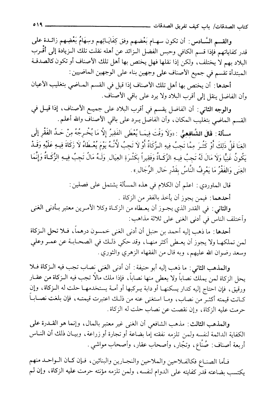 وَالْقِسْمُ السَّادِسُ: أَنْ تَكُونَ سِهَامُ بَعْضِهِمْ وَفْقَ كِفَايَاتِهِمْ وَسِهَامُ بَعْضِهِمْ زَائِدَةً عَلَى قَدْرِ كِفَايَاتِهِمْ فَإِذَا قَسَّمَ الْكَافِيَ وَحَبَسَ الْفَضْلَ الزَّائِدَ عَنْ أَهْلِهِ نُقِلَتْ تِلْكَ الزِّيَادَةُ إِلَى أَقْرَبِ الْبِلَادِ بِهِمْ لَا يَخْتَلِفُ، وَلَكِنْ إِذَا نَقَلَهَا فَهَلْ يَخْتَصُّ بِهَا أَهْلُ تِلْكَ الْأَصْنَافِ أَوْ تَكُونُ كَالصَّدَقَةِ الْمُبْتَدَأَةِ تُقَسَّمُ فِي جَمِيعِ الْأَصْنَافِ عَلَى وجهين بناء على الوجهين الماضيين: