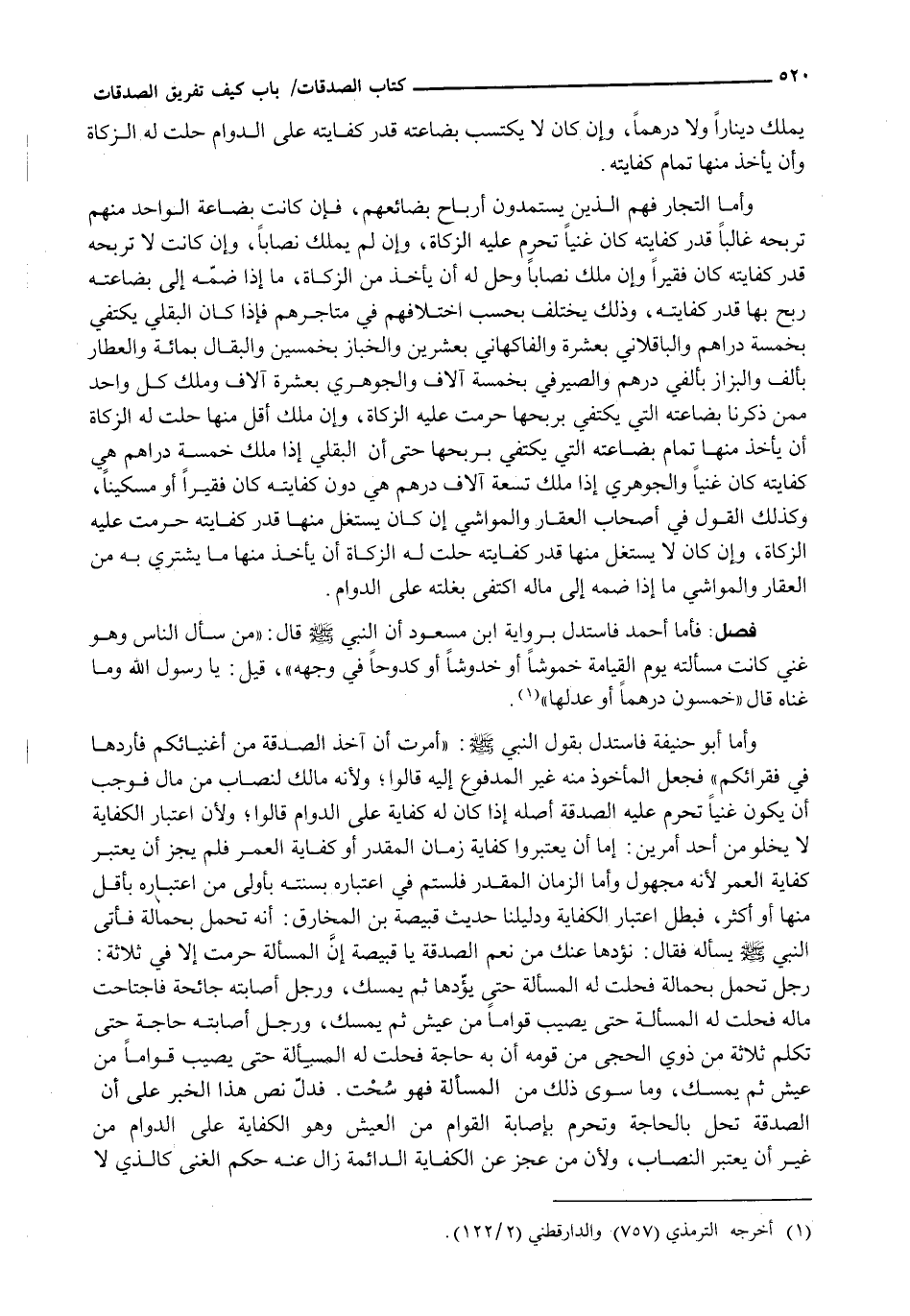 وَأَمَّا أبو حنيفة فَاسْتَدَلَّ بِقَوْلِ النَّبِيِّ - صَلَّى اللَّهُ عَلَيْهِ وَسَلَّم َ -: " أُمِرْتُ أَنْ آخُذَ الصَّدَقَةَ مِنْ أَغْنِيَائِكُمْ فَأَرُدَّهَا فِي فُقَرَائِكُمْ " فَجَعَلَ الْمَأْخُوذَ مِنْهُ غَيْرَ الْمَدْفُوعِ إِلَيْهِ قَالُوا؛ وَلِأَنَّهُ مَالِكٌ لِنِصَابٍ مِنْ مَالٍ فَوَجَبَ أَنْ يَكُونَ غَنِيًّا تَحْرُمُ عَلَيْهِ الصَّدَقَةُ أَصْلُهُ إِذَا كَانَ لَهُ كِفَايَةٌ عَلَى الدَّوَامِ قَالُوا: وَلِأَنَّ اعْتِبَارَ الْكِفَايَةِ لَا يَخْلُو مِنْ أَحَدِ أَمْرَيْنِ: إِمَّا أَنْ يَعْتَبِرُوا كِفَايَةَ زَمَانِ الْمُقَدَّرِ أَوْ كِفَايَةَ الْعُمُرِ فَلَمْ يَجُزْ أَنْ يُعْتَبَرَ كِفَايَةُ الْعُمُرِ لِأَنَّهُ مَجْهُولٌ وَأَمَّا الزَّمَانُ الْمُقَدَّرُ فَلَسْتُمْ فِي اعْتِبَارِهِ بِسَنَتِهِ بِأَوْلَى مِنِ اعْتِبَارِهِ بِأَقَلَّ مِنْهَا أَوْ أَكْثَرَ، فَبَطَلَ اعْتِبَارُ الْكِفَايَةِ وَدَلِيلُنَا حَدِيثُ قَبِيصَةَ بْنِ الْمُخَارِقِ: أَنَّهُ تَحَمَّلَ بِحَمَالَةٍ فَأَتَى النَّبِيَّ - صَلَّى اللَّهُ عَلَيْهِ وَسَلَّم َ - يَسْأَلُهُ فَقَالَ: نُؤَدِّهَا عَنْكَ مِنْ نَعَمِ الصَّدَقَةِ يَا قَبِيصَةُ إِنَّ الْمَسْأَلَةَ حُرِّمَتْ إِلَّا فِي ثَلَاثَةٍ: رَجُلٍ تَحَمَّلَ بِحَمَالَةٍ فَحَلَّتْ لَهُ الْمَسْأَلَةُ حتى يؤدها ثُمَّ يُمْسِكُ، وَرَجُلٍ أَصَابَتْهُ جَائِحَةٌ فَاجْتَاحَتْ مَالَهُ فَحَلَّتْ لَهُ الْمَسْأَلَةُ حَتَّى يُصِيبَ قَوَامًا مِنْ عَيْشٍ ثُمَّ يُمْسِكُ، وَرَجُلٍ أَصَابَتْهُ حَاجَةٌ حَتَّى تَكَلَّمَ ثَلَاثَةٌ مِنْ ذَوِي الْحِجَى مِنْ قَوْمِهِ أَنَّ بِهِ حَاجَةً فَحَلَّتْ لَهُ الْمَسْأَلَةُ حَتَّى يُصِيبَ قَوَامًا مِنْ عَيْشٍ ثُمَّ يُمْسِكُ، وَمَا سِوَى ذَلِكَ مِنَ الْمَسْأَلَةِ فَهُوَ سُحْتٌ. فَدَلَّ نَصُّ هَذَا الْخَبَرِ عَلَى أَنَّ الصَّدَقَةَ تَحِلُّ بِالْحَاجَةِ وَتَحْرُمُ بِإِصَابَةِ الْقَوَامِ مِنَ الْعَيْشِ وَهُوَ الْكِفَايَةُ عَلَى الدَّوَامِ مِنْ غَيْرِ أَنْ يُعْتَبَرَ النِّصَابُ، وَلِأَنَّ مَنْ عَجَزَ عَنِ الْكِفَايَةِ الدَّائِمَةِ زَالَ عَنْهُ حُكْمُ الْغِنَى كَالَّذِي لَا