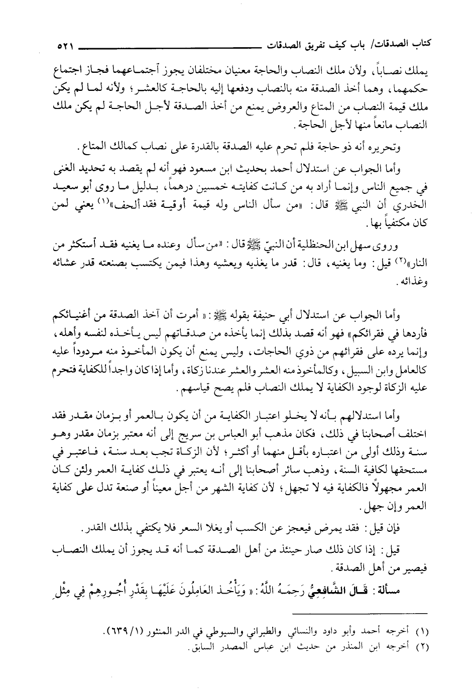وَأَمَّا الْجَوَابُ عَنِ اسْتِدْلَالِ أبي حنيفة بِقَوْلِهِ - صَلَّى اللَّهُ عَلَيْهِ وَسَلَّم َ -: " أُمِرْتُ أَنْ آخُذَ الصَّدَقَةَ مِنْ أَغْنِيَائِكُمْ فَأَرُدَّهَا فِي فُقَرَائِكُمْ " فَهُوَ أَنَّهُ قَصَدَ بِذَلِكَ إِنَّمَا يَأْخُذُهُ مِنْ صَدَقَاتِهِمْ لَيْسَ يَأْخُذُهُ لِنَفْسِهِ وَأَهْلِهِ، وَإِنَّمَا يَرُدُّهُ عَلَى فُقَرَائِهِمْ مِنْ ذَوِي الْحَاجَاتِ، وَلَيْسَ يَمْنَعُ أَنْ يَكُونَ الْمَأْخُوذُ مِنْهُ مَرْدُودًا عَلَيْهِ كَالْعَامِلِ وَابْنِ السَّبِيلِ، وَكَالْمَأْخُوذِ مِنْهُ الْعُشْرُ وَالْعُشْرُ عِنْدَنَا زَكَاةٌ، وَأَمَّا إِذَا كَانَ وَاجِدًا لِلْكِفَايَةِ فَتَحْرُمُ عَلَيْهِ الزَّكَاةُ لِوُجُودِ الْكِفَايَةِ لَا يَمْلِكُ النِّصَابَ فَلَمْ يَصِحَّ قِيَاسُهُمْ.