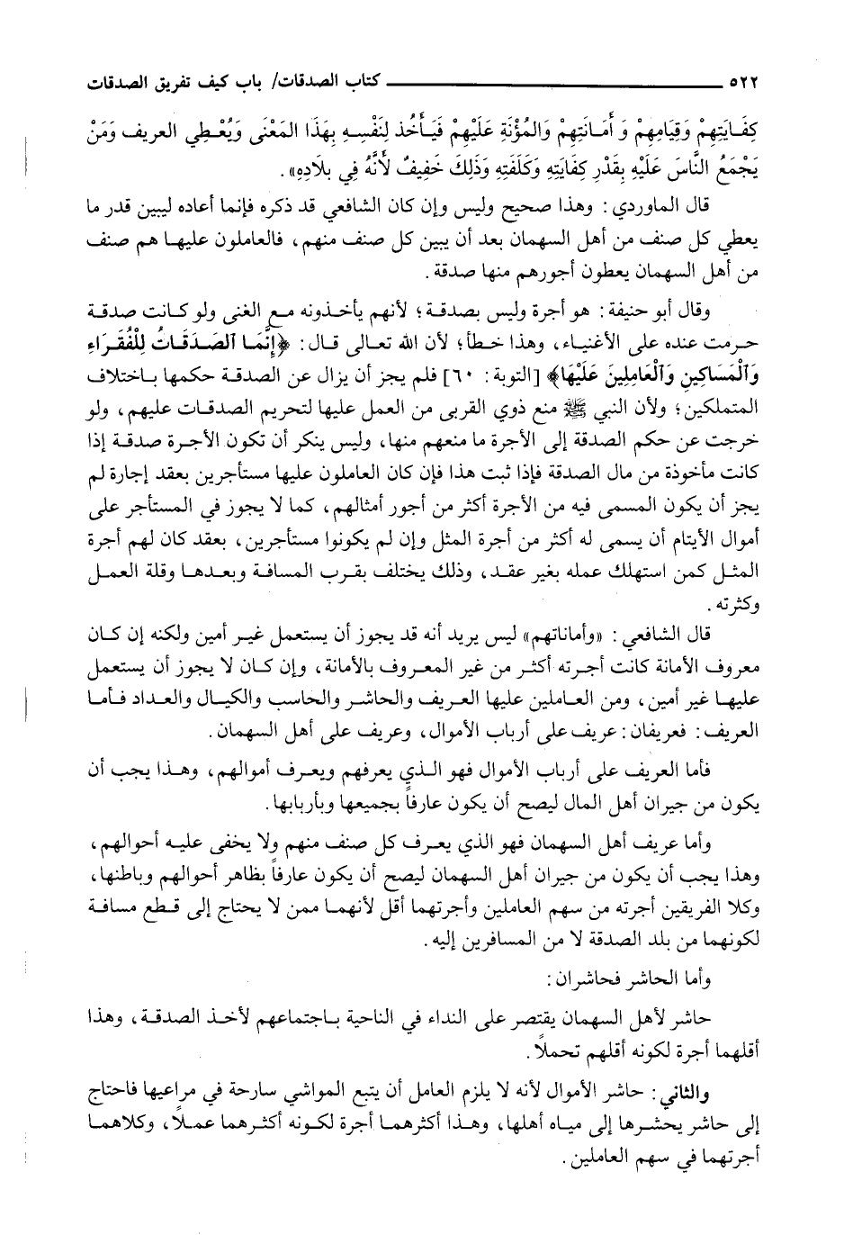 قَالَ الْمَاوَرْدِيُّ: وَهَذَا صَحِيحٌ وَلَيْسَ وَإِنْ كَانَ الشَّافِعِيُّ قَدْ ذَكَرَهُ فَإِنَّمَا أَعَادَهُ لِيُبَيِّنَ قَدْرَ مَا يُعْطَى كُلُّ صِنْفٍ مِنْ أَهْلِ السُّهْمَانِ بَعْدَ أَنْ يُبَيِّنَ كُلَّ صِنْفٍ مِنْهُمْ، فَالْعَامِلُونَ عَلَيْهَا هُمْ صِنْفٌ مِنْ أَهْلِ السُّهْمَانِ يُعْطَوْنَ أُجُورَهُمْ مِنْهَا صَدَقَةً.