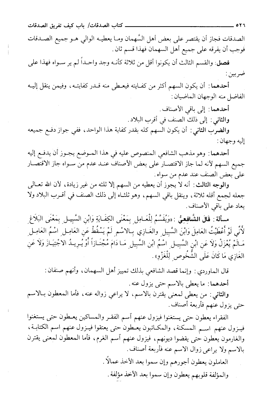 الصَّدَقَاتِ فَجَازَ أَنْ يَقْتَصِرَ عَلَى بَعْضِ أَهْلِ السُّهْمَانِ وَمَا يُعْطِيهِ الْوَالِي هُوَ جَمِيعُ الصَّدَقَاتِ فَوَجَبَ أَنْ يُفَرِّقَهُ عَلَى جَمِيعِ أَهْلِ السُّهْمَانِ فَهَذَا قِسْمٌ ثَانٍ.