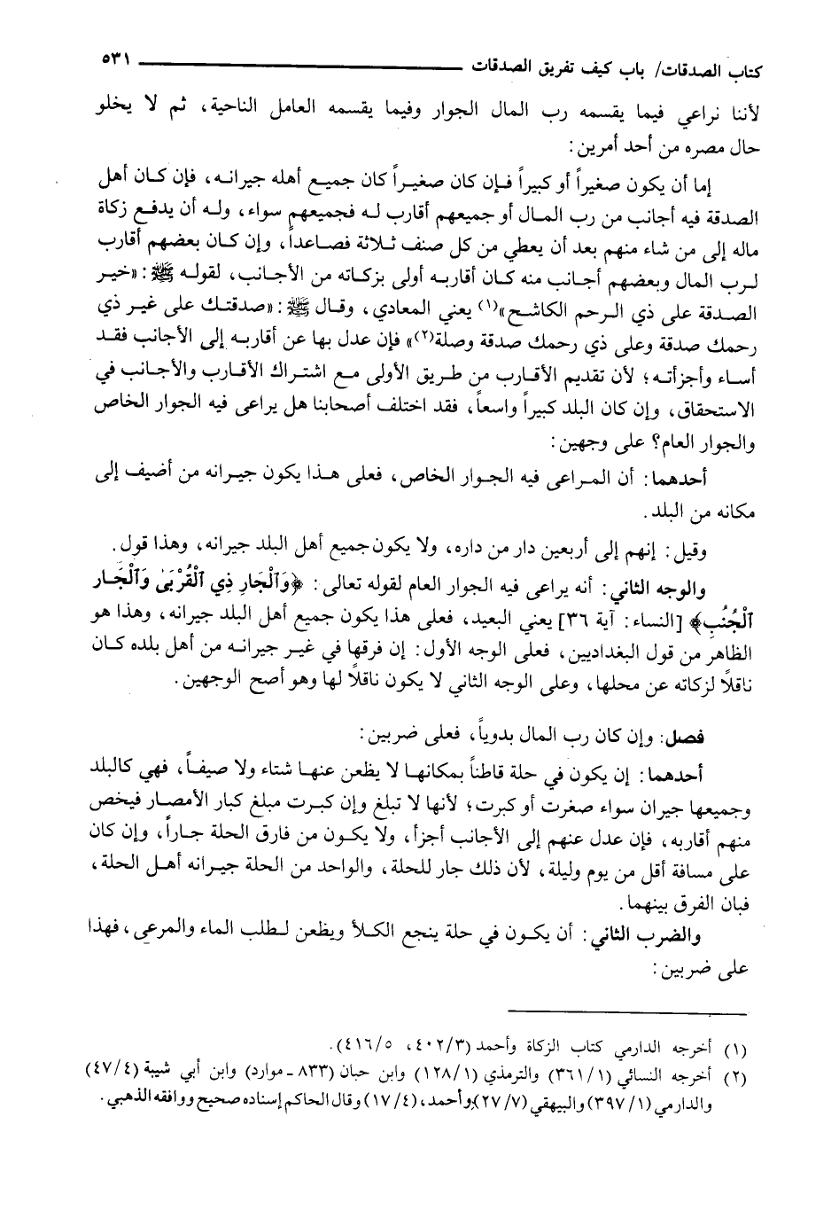 إِمَّا أَنْ يَكُونَ صَغِيرًا أَوْ كَبِيرًا فَإِنْ كَانَ صَغِيرًا كَانَ جَمِيعُ أَهْلِهِ جِيرَانَهُ، فَإِنْ كَانَ أَهْلُ الصَّدَقَةِ فِيهِ أَجَانِبَ مِنْ رَبِّ الْمَالِ أَوْ جَمِيعُهُمْ أَقَارِبَ لَهُ فَجَمِيعُهُمْ سَوَاءٌ، وَلَهُ أَنْ يَدْفَعَ زَكَاةَ مَالِهِ إِلَى مَنْ شَاءَ مِنْهُمْ بَعْدَ أَنْ يُعْطِيَ مِنْ كُلِّ صِنْفٍ ثَلَاثَةً فَصَاعِدًا، وَإِنْ كَانَ بَعْضُهُمْ أَقَارِبَ لِرَبِّ الْمَالِ وَبَعْضُهُمْ أَجَانِبَ مِنْهُ كَانَ أَقَارِبُهُ أَوْلَى بِزَكَاتِهِ مِنَ الْأَجَانِبِ، لِقَوْلِهِ - صَلَّى اللَّهُ عَلَيْهِ وَسَلَّم َ -: " خَيْرُ الصَّدَقَةِ عَلَى ذِي الرَّحِمِ الْكَاشِحِ " يَعْنِي المعادي، وقال - صَلَّى اللَّهُ عَلَيْهِ وَسَلَّم َ -: " صَدَقَتُكَ عَلَى غَيْرِ ذِي رَحِمِكَ صَدَقَةٌ وَعَلَى ذِي رَحِمِكَ صَدَقَةٌ وَصِلَةٌ " فَإِنْ عَدَلَ بِهَا عَنْ أَقَارِبِهِ إِلَى الْأَجَانِبِ فَقَدْ أَسَاءَ وَأَجْزَأَتْهُ؛ لِأَنَّ تَقْدِيمَ الْأَقَارِبِ مِنِ طَرِيقِ الْأَوْلَى مَعَ اشْتِرَاكِ الْأَقَارِبِ وَالْأَجَانِبِ فِي الِاسْتِحْقَاقِ، وَإِنْ كَانَ الْبَلَدُ كَبِيرًا وَاسِعًا، فَقَدِ اخْتَلَفَ أَصْحَابُنَا هَلْ يراعى فيه الجوار الخاص والجوار الْعَامُّ؟ عَلَى وَجْهَيْنِ: