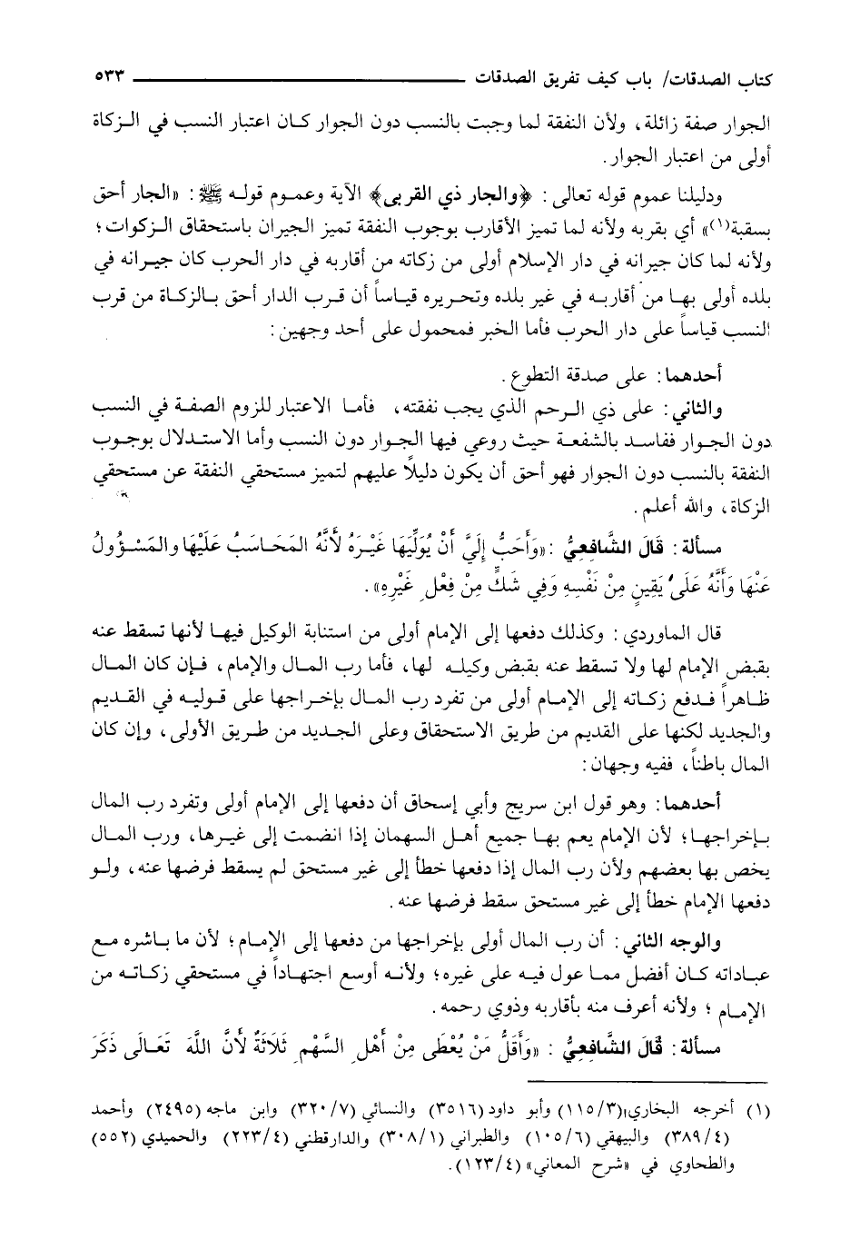 وَالثَّانِي: عَلَى ذِي الرَّحِمِ الَّذِي يَجِبُ نَفَقَتُهُ، فَأَمَّا الِاعْتِبَارُ لِلُزُومِ الصِّفَةِ فِي النَّسَبِ دُونَ الْجِوَارِ فَفَاسِدٌ بِالشُّفْعَةِ حَيْثُ رُوعِيَ فِيهَا الْجِوَارُ دُونَ النَّسَبِ وَأَمَّا الِاسْتِدْلَالُ بِوُجُوبِ النَّفَقَةِ بِالنَّسَبِ دُونَ الْجِوَارِ فَهُوَ أَحَقُّ أَنْ يَكُونَ دَلِيلًا عَلَيْهِمْ لِتَمَيُّزِ مُسْتَحِقِّي النَّفَقَةِ عَنْ مُسْتَحِقِّي الزَّكَاةِ، وَاللَّهُ أَعْلَمُ.