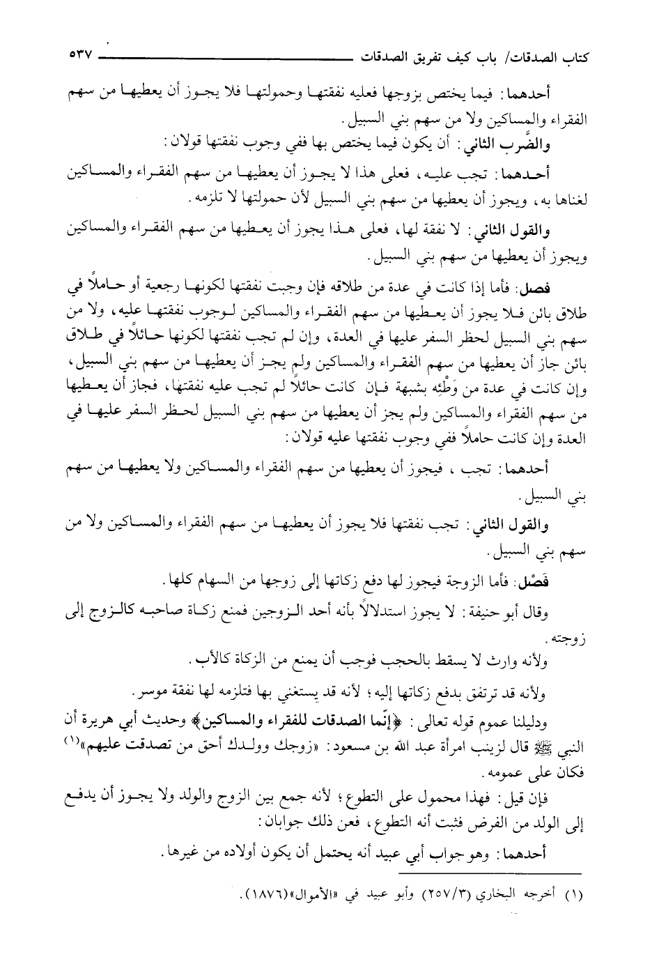 أَحَدُهُمَا: فِيمَا يَخْتَصُّ بِزَوْجِهَا فَعَلَيْهِ نَفَقَتُهَا وَحُمُولَتُهَا فَلَا يَجُوزُ أَنْ يُعْطِيَهَا مِنْ سَهْمِ الْفُقَرَاءِ وَالْمَسَاكِينِ وَلَا مِنْ سَهْمِ بَنِي السَّبِيلِ.